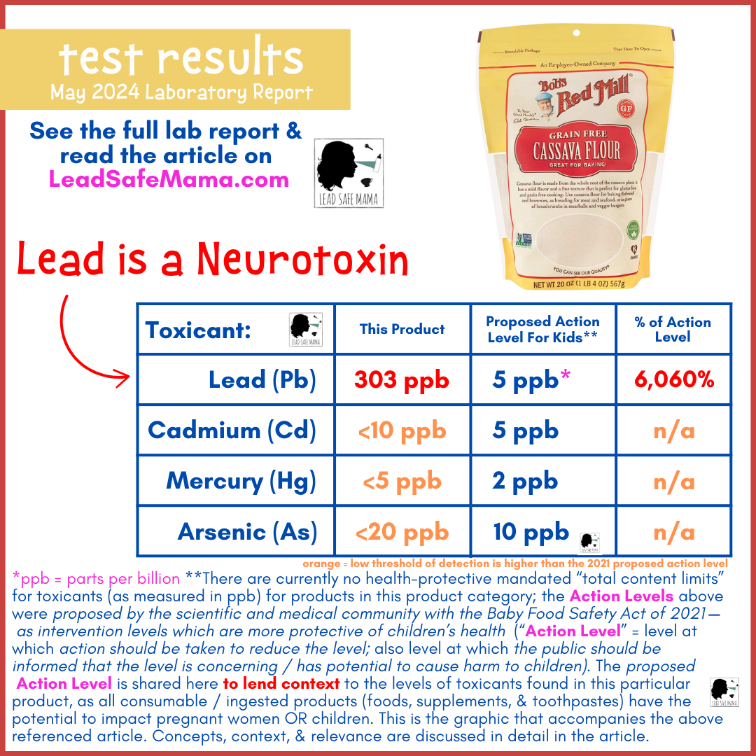 The Lead-concern is primarily with Cassava-flour and Cassava-flour based food products. Please read the overview article on this link: https://tamararubin.com/2024/05/cassava-testing-bobs-red-mill-cassava-flour-tested-for-lead-cadmium-mercury-arsenic/