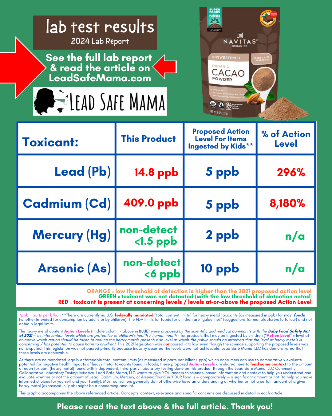 Lead Safe Mama concludes that “Navitas Unsweetened Organic Cacao Powder tests positive for unsafe levels of Lead and Cadmium — August 2024 laboratory report “: https://tamararubin.com/2024/09/navitas-unsweetened-organic-cacao-powder-tests-positive-for-unsafe-levels-of-lead-and-cadmium-august-2024-laboratory-test-report-here/