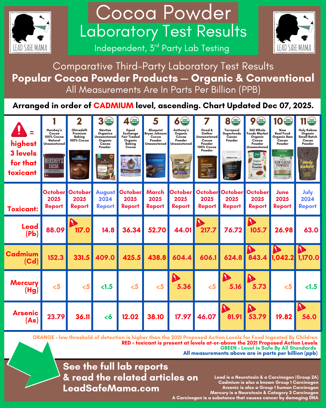The image on this page shows a comparative chart of toxicant levels found in the eleven different cocoa or cacao powder products we have tested and reported on to date. Below, you’ll find links to the articles containing lab reports for each of the products noted in the chart. The products in this chart are arranged in ascending order based on their Cadmium levels. Cadmium is a known carcinogen, with exposure confirmed as being causally linked to cancer.