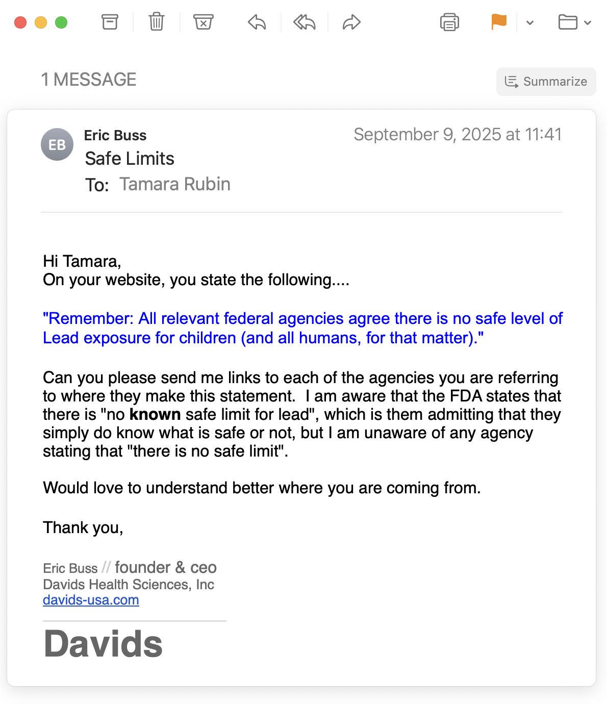 Below is the September 2025 email exchange I had with the owner of Davids toothpaste. First, there is an image of each communication, followed by the text for that communication (with clickable links) for those using a text reader. Thanks for reading! Frankly, I was flabbergasted by Eric’s interpretation of the FDA’s language — reminding me of the following Upton Sinclair quote: