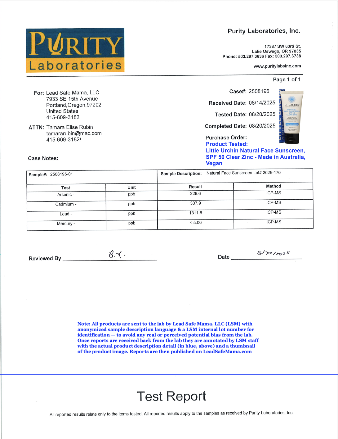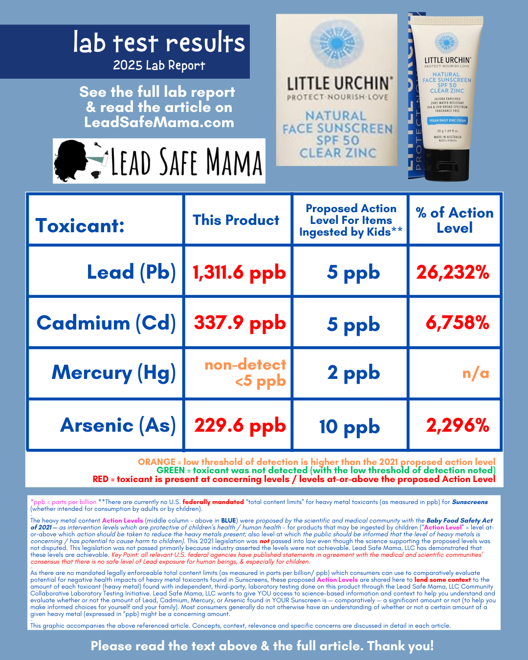 Testing Little Urchin Natural Face Sunscreen, SPF 50 (Made in Australia) for Lead, Cadmium, Mercury, and Arsenic with Independent, Third-Party Laboratory Analysis