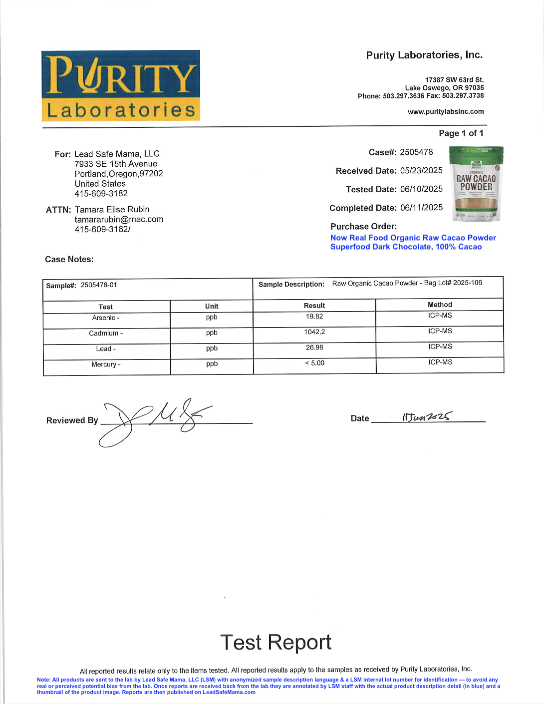 Testing Now Real Food Organic Raw Cacao Powder for Lead, Cadmium, Mercury, and Arsenic with Independent, Third-Party Laboratory Analysis