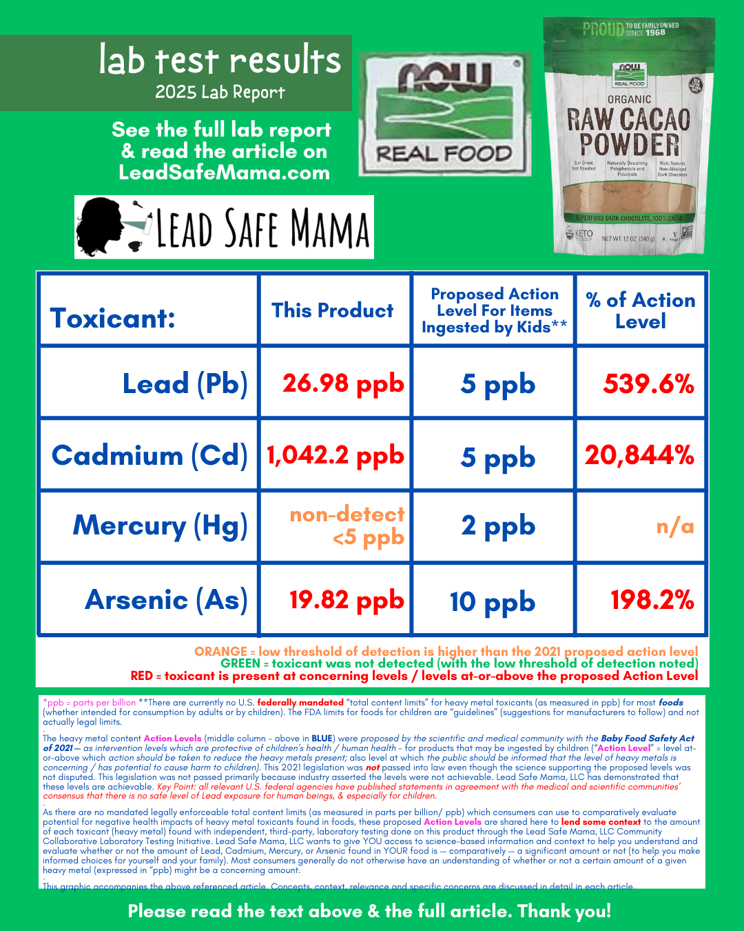 - This Now Real Food Organic Raw Cacao Powder tested positive for the second highest level of Cadmium out of all of the cacao / cocoa powders that we have tested and reported on so far.