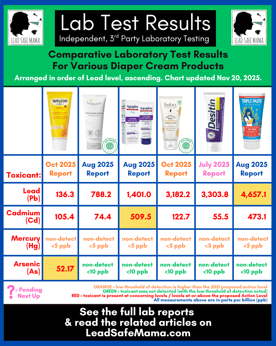 We do, however, have ongoing concerns that several heavily Lead-contaminated (and Cadmium-Contaminated) ointments continue to be listed as safer choices (and even “Top Choices”) in that article online. This is especially concerning as it is an article published by Consumer Reports — a source that parents and grandparents trust for science-based, impartial, unbiased information. We felt it was critical to make our concerns public given Consumer Reports has not made any further edits to the article as of the date of publishing this article here on LeadSafeMama.com (November 20, 2025), and given that parents often use Consumer Reports as a reference guide to look up the safety of products.