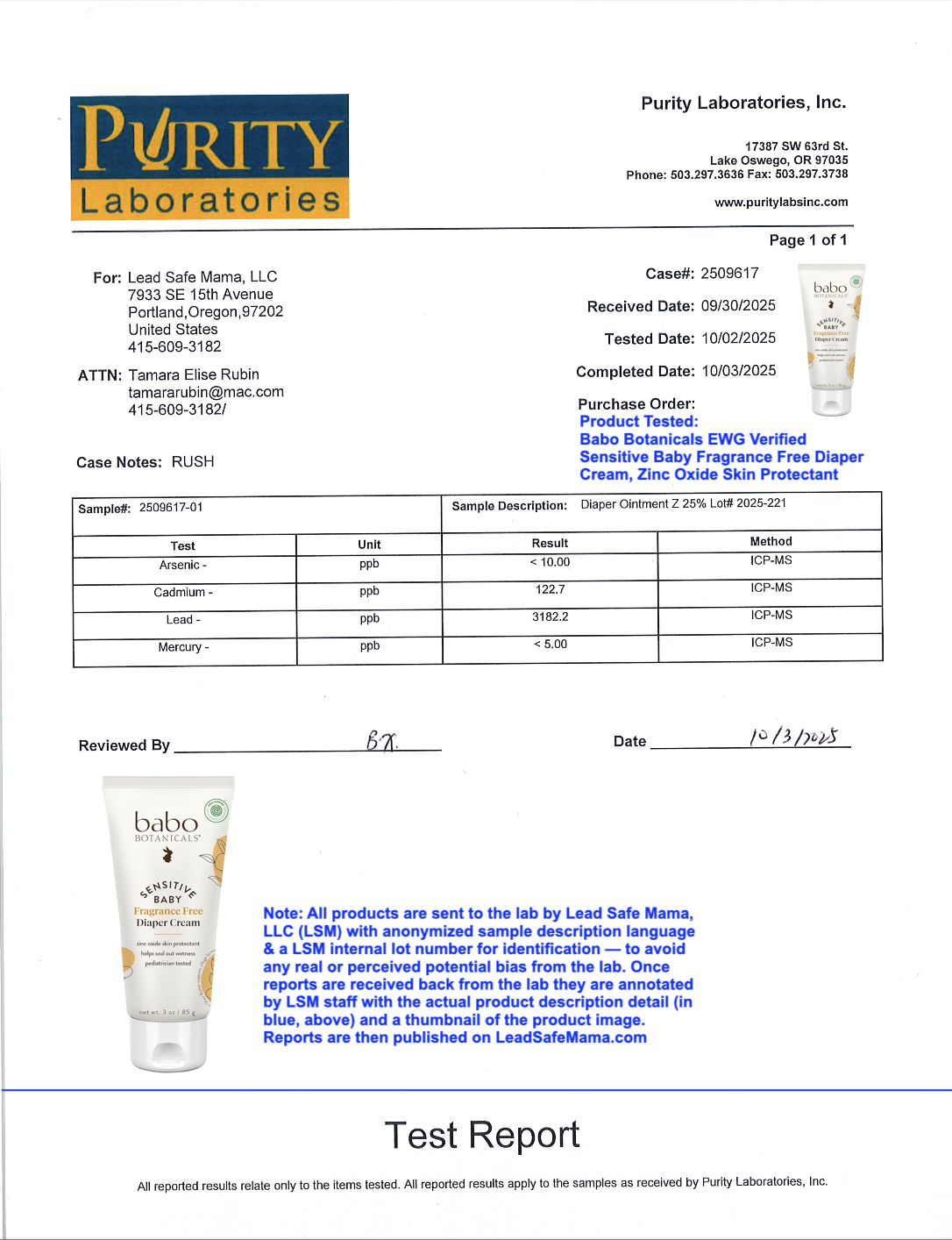 Testing “EWG Verified” Babo Botanicals Fragrance Free Diaper Cream for Lead, Cadmium, Mercury, & Arsenic with Independent, Third-Party, Laboratory Testing