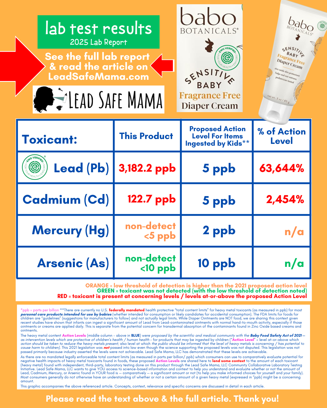 This “EWG Verified” Babo Botanicals Sensitive Baby Fragrance Free Diaper Cream tested positive for extremely concerning levels of Lead (one of the highest results yet for a diaper ointment with the testing and reporting we have done to date) and also for concerning levels of Cadmium . It’s alarming to also know that this is an “EWG Verified” product (EWG’s top rating) especially as it is a product used on the skin of babies and there are concerns for both ingestion risks and transdermal exposure risk for the contaminants found in this product (read more about that here). Lead is a noted Neurotoxin and Carcinogen. Cadmium is also a known Carcinogen.