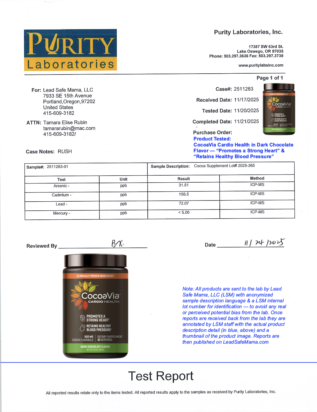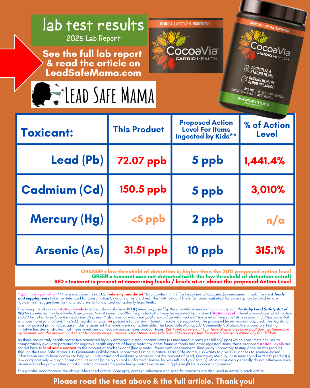 Testing CocoaVia Cardio Health Supplement Powder for Lead, Cadmium, Mercury, & Arsenic With Independent, Third-Party, Laboratory Testing