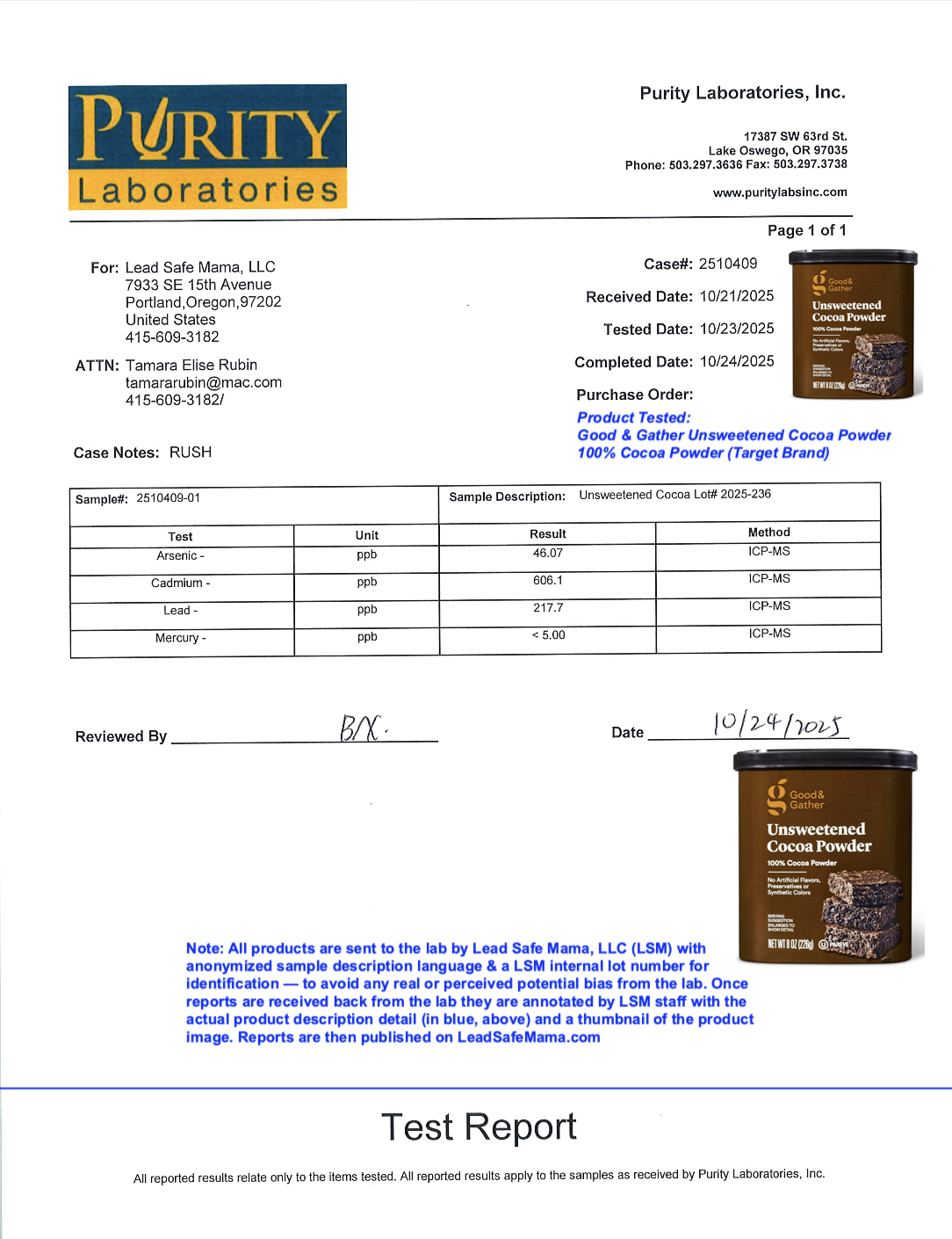 Testing Good & Gather (Target Brand) Unsweetened 100% Cocoa Powder for Lead, Cadmium, Mercury, & Arsenic with Independent, Third-Party, Laboratory Testing