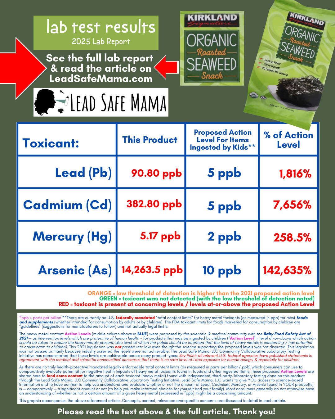 This popular organic seaweed snack product from Costco (their Kirkland Signature brand Organic Roasted Seaweed Snacks) tested positive for concerning levels of Lead, Cadmium, Mercury, and Arsenic — all FOUR of the heavy metals we test for…. and check out those ARSENIC levels!