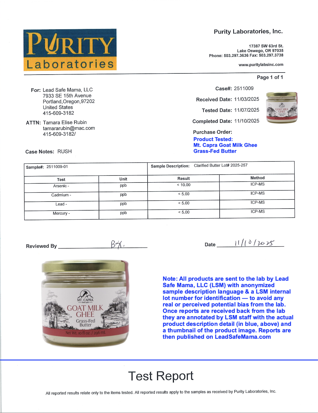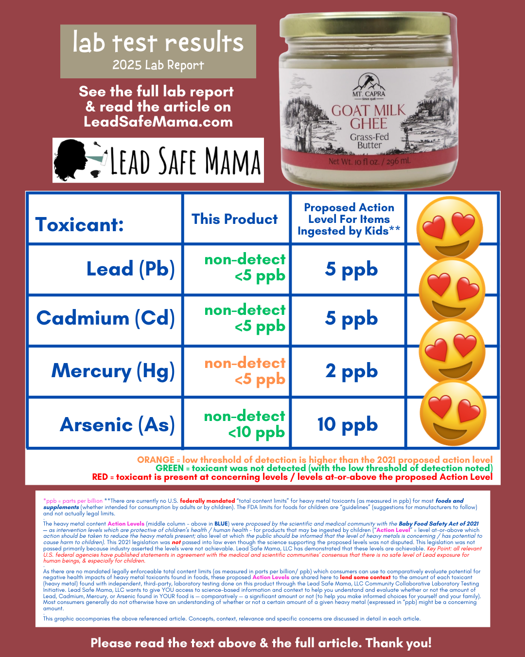 Testing Mt. Capra Goat Milk Ghee Grass-Fed Butter for Lead, Cadmium, Mercury, & Arsenic with Independent, Third-Party, Laboratory Testing