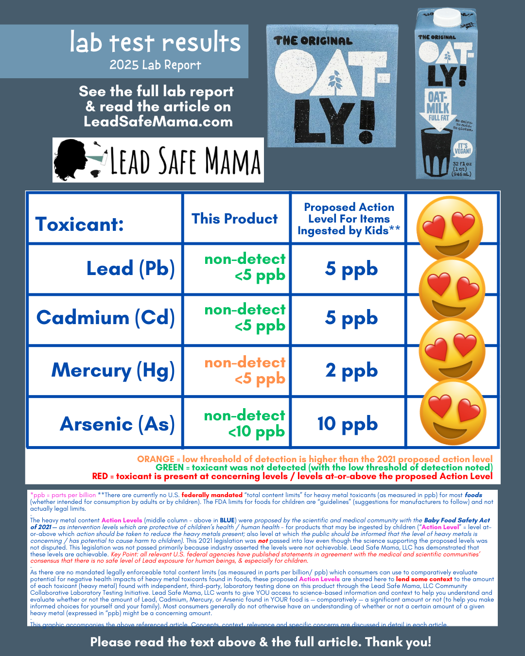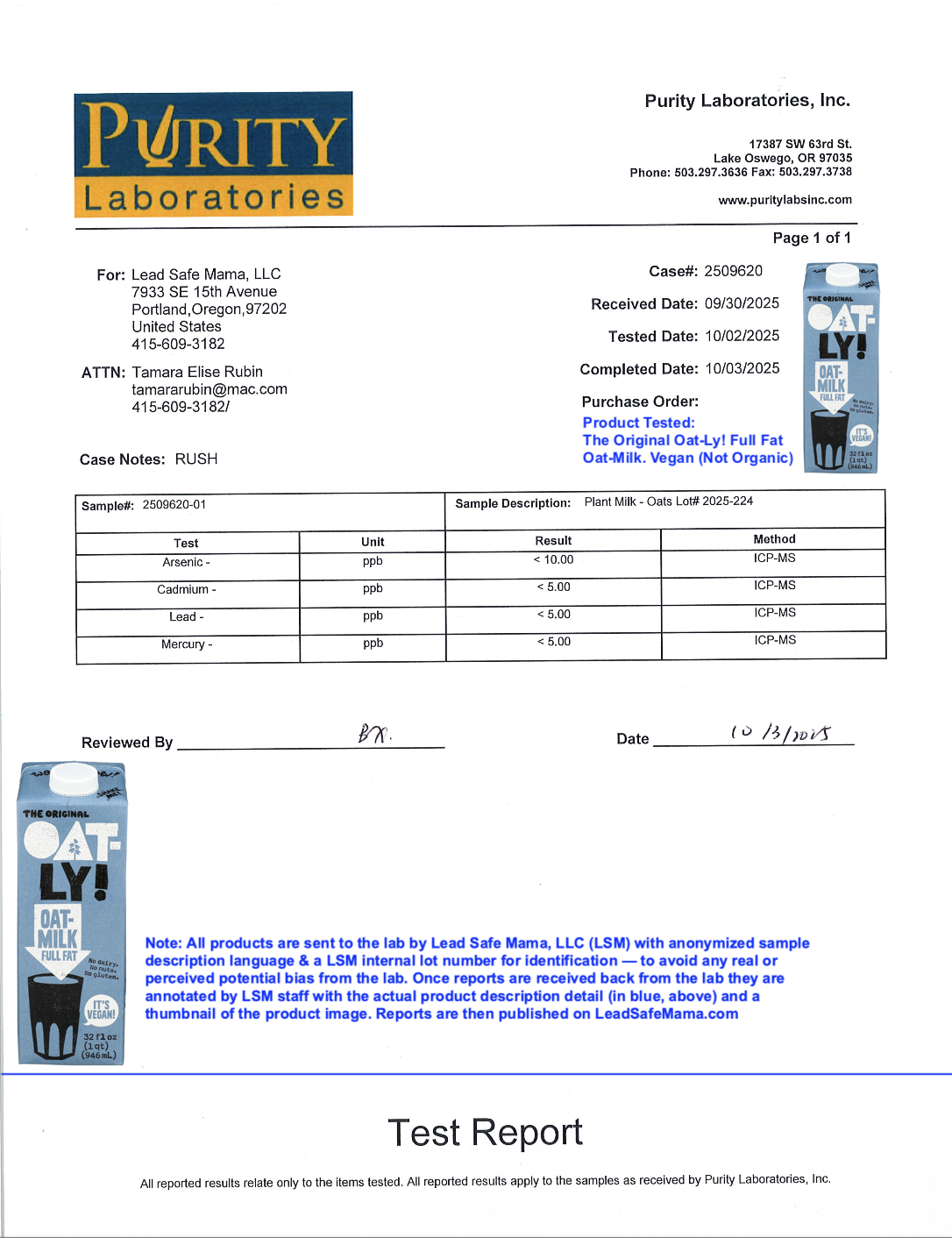 Testing Oat-Ly Full Fat Oat-Milk for Lead, Cadmium, Mercury, and Arsenic with Independent, Third-Party Laboratory Analysis