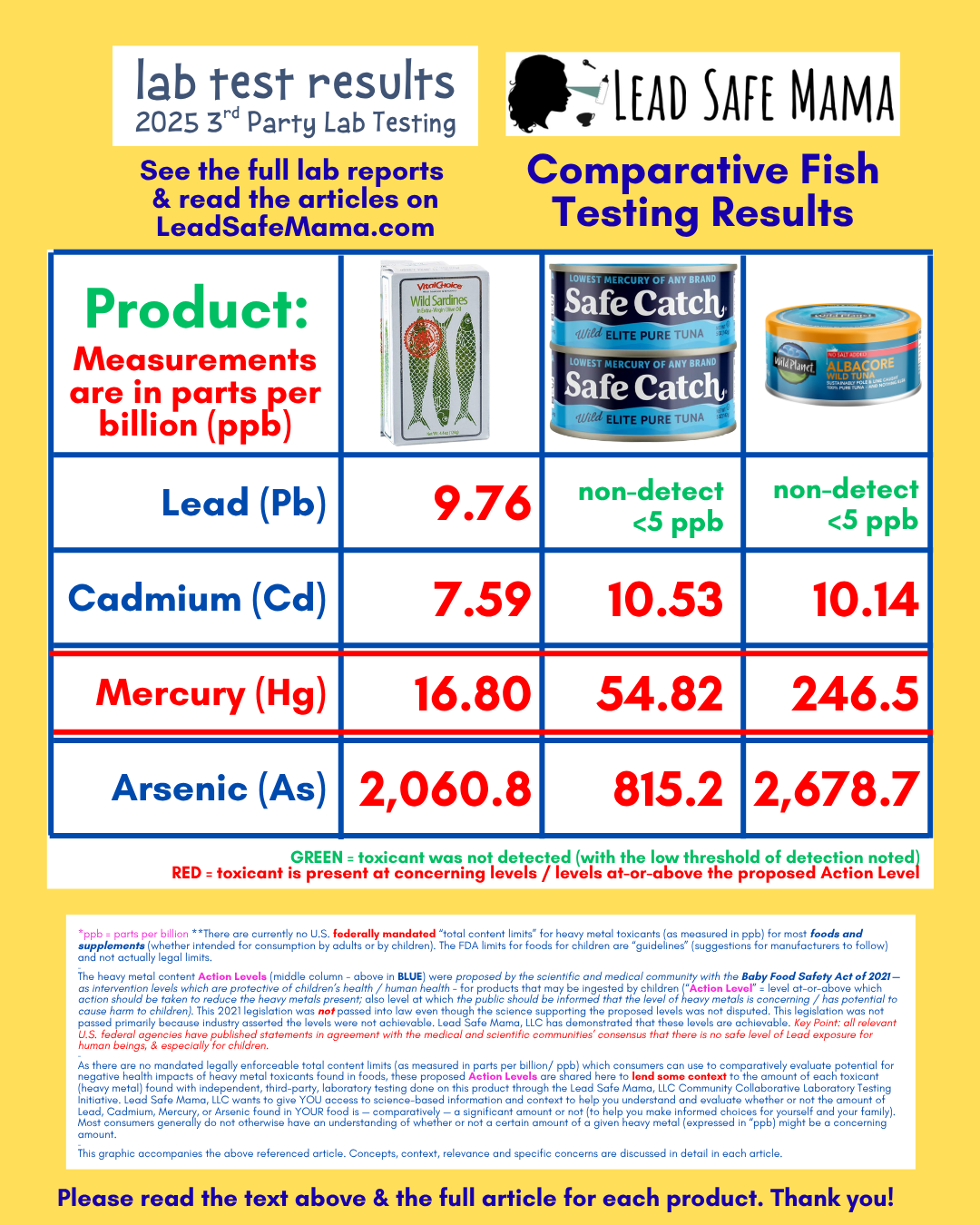 Scroll down to see our social media sharable graphic for this product as well as a comparative chart showing the levels of toxicants found in other fish products (including sardines and tuna) that we have tested to date.