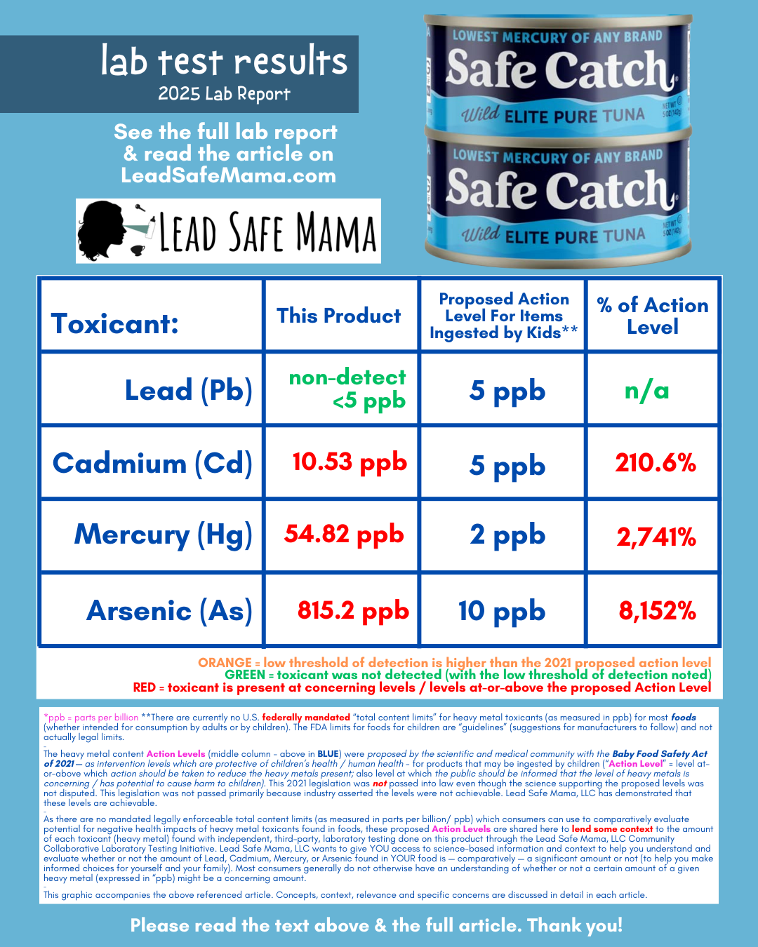 Thank you! Glad the mercury level DOES match their claims, as they publicize every “Elite” fish to be MAX 100 PPB, but “avg. closer to 40 PPB”. (But why is arsenic so high in all three fish products??) So “elite” is verified way less toxic than “Wild Planet”… But to your point, yes, is “the official tuna of the American Pregnancy Association” truly safe with ANY mercury? It’s sad this is the “safest” our poor planet can offer … Ref.: