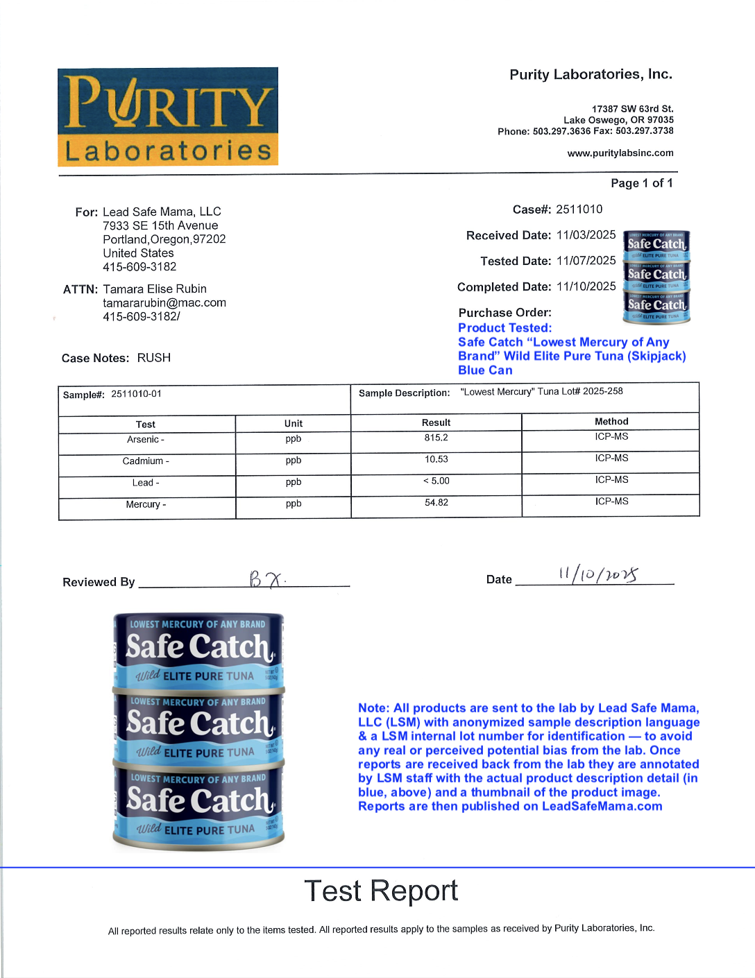 Given the sardines came in at 16.8 ppb Mercury, and the Wild Planet Tuna came in at 246.5 ppb Mercury, I had specifically hypothesized that the Safe Catch Tuna would likely fall between those two (at the lower end, closer to the Sardines), and even suggested this product might test positive for about 50 ppb Mercury. Well… my educated guess was spot on in this case! Please scroll down to see the lab test results in our shareable social media graphics, and scroll to the bottom of this article (past our full Lab-tested safer choices list) to see the full original lab report for this tuna product.