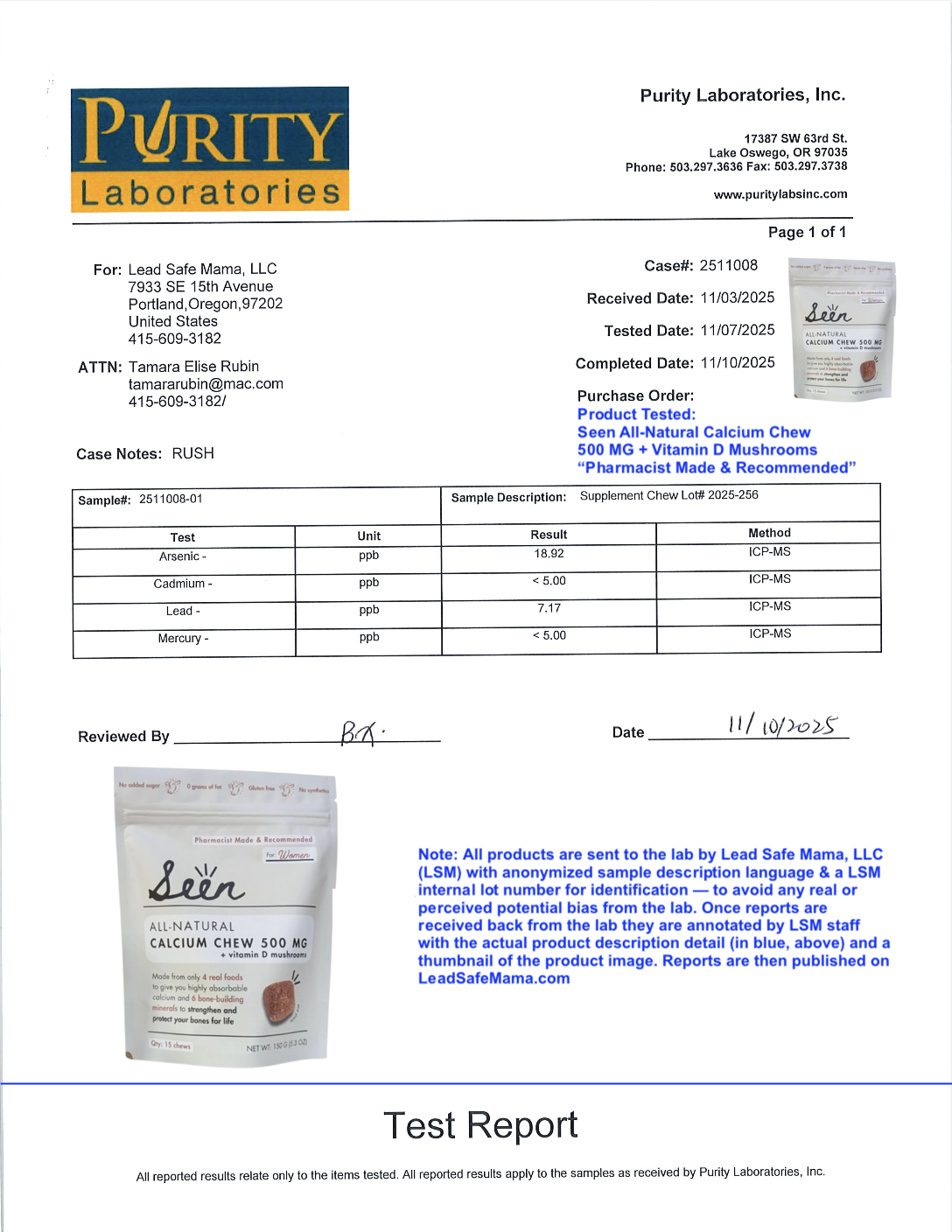 Testing Seen Chews Calcium Supplement For Women for Lead, Cadmium, Mercury, and Arsenic with Independent, Third-Party Laboratory Analysis