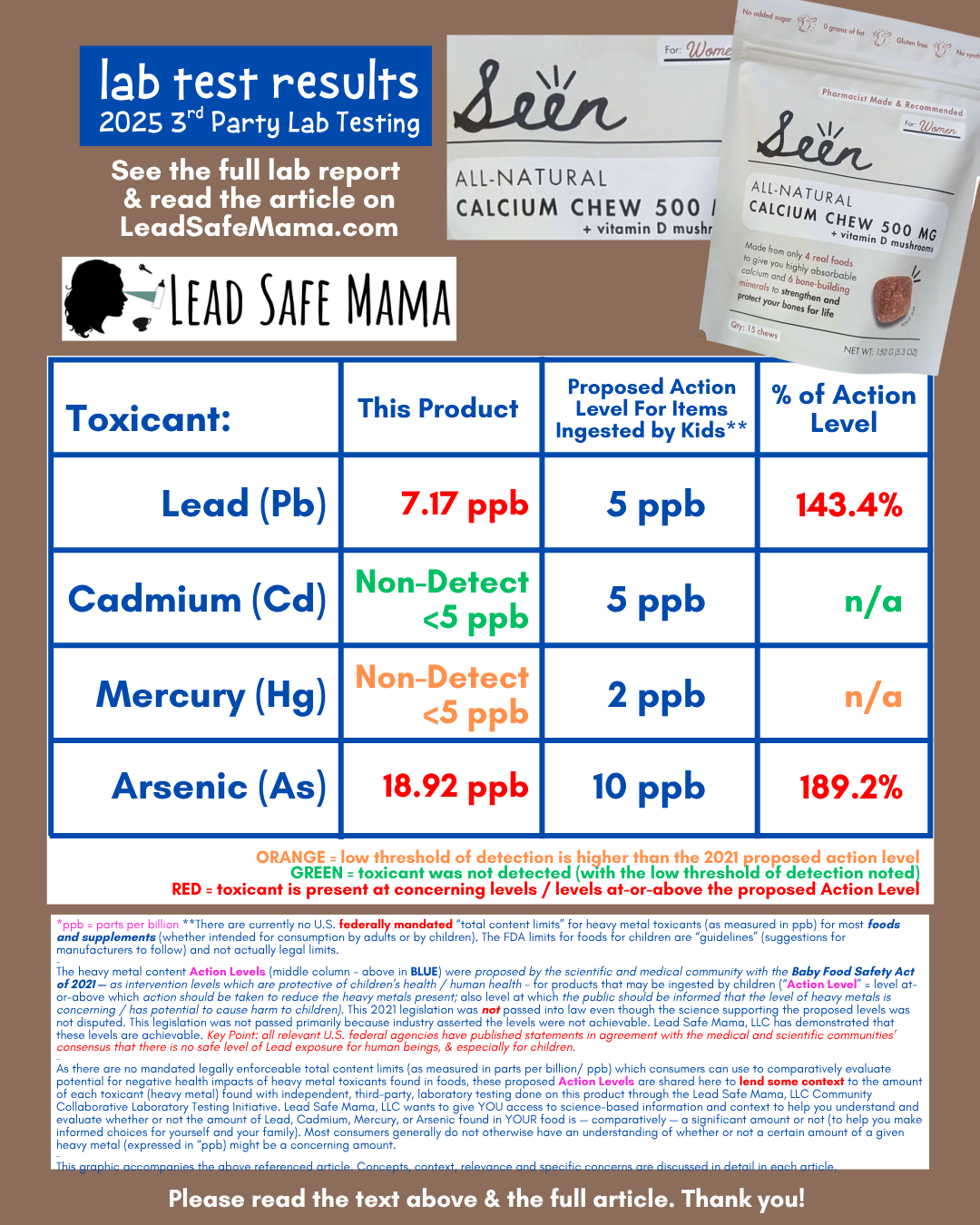 These “Seen Chews” – all natural calcium chew supplement (for women) pictured above, tested positive for both Lead and Arsenic, but at the lowest levels we have found to date for any of the Calcium products we have tested (when compared to both single-ingredient Calcium Carbonate tested separately and two other products specifically sold and marketed as Calcium supplements).