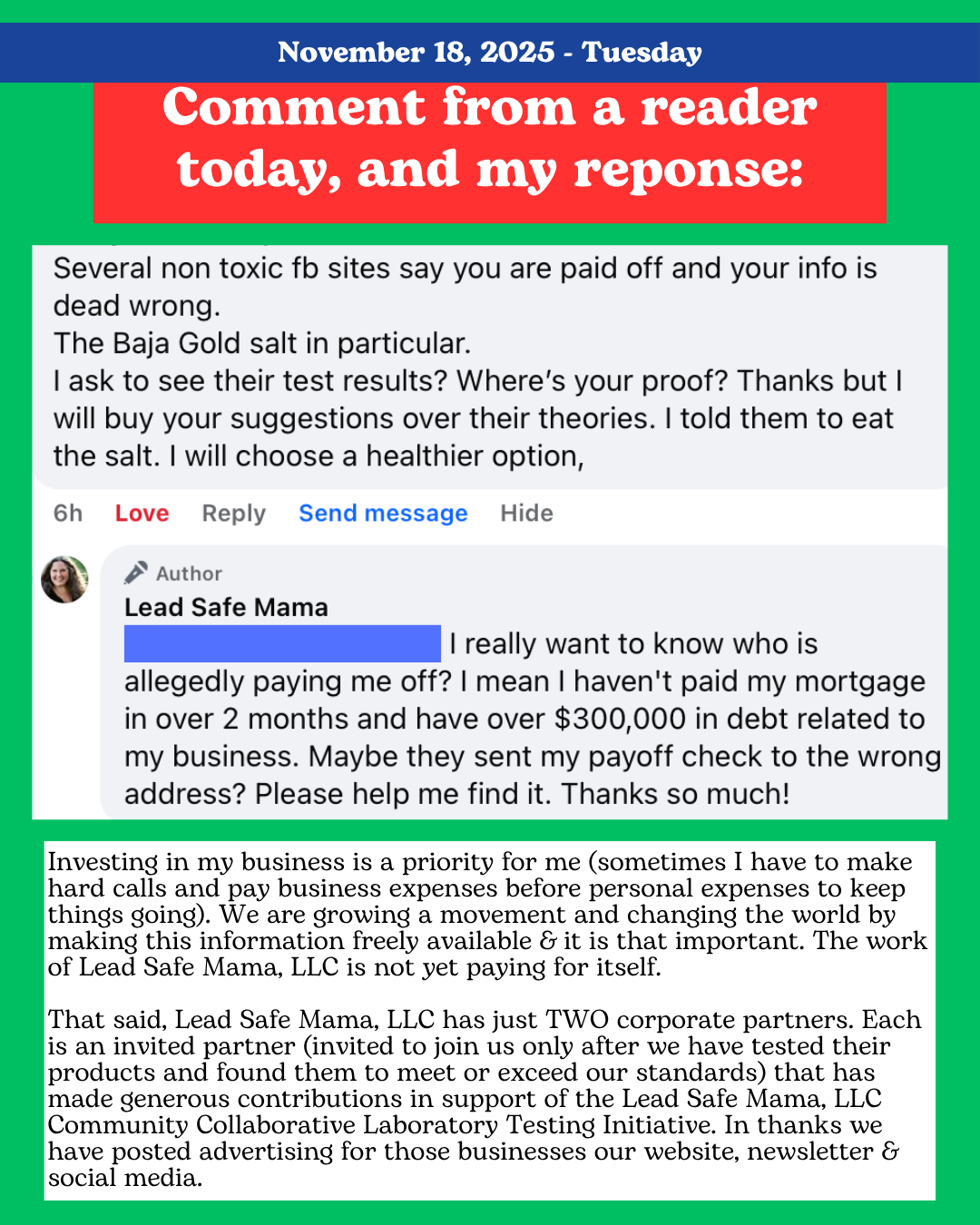 Please read the comments on the image above and then read the text below, which I just shared on social media. I also want to note that EACH infographic has the following words on it: “See The Full Lab Reports and Read The Articles on Lead Safe Mama dot com” – or some variation of that text! It’s so frustrating to me sometimes when people don’t bother to read what’s in front of them, and then jump to funny conclusions because they don’t take the time to actually read. #Sigh.