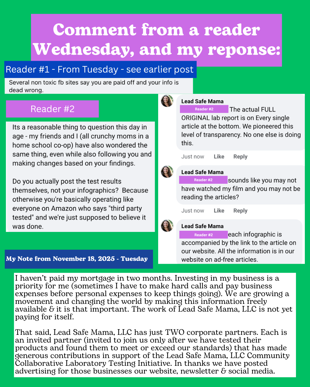 Please read the comments on the image above and then read the text below, which I just shared on social media. I also want to note that EACH infographic has the following words on it: “See The Full Lab Reports and Read The Articles on Lead Safe Mama dot com” – or some variation of that text! It’s so frustrating to me sometimes when people don’t bother to read what’s in front of them, and then jump to funny conclusions because they don’t take the time to actually read. #Sigh.