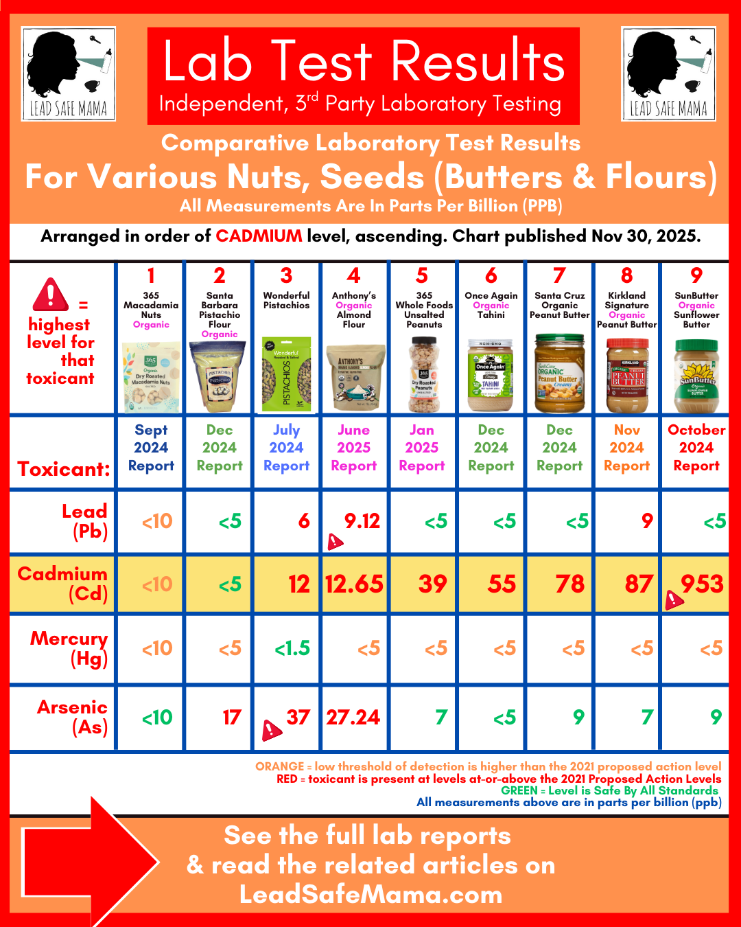 The image on this page is a comparative chart of toxicant levels found in nine different Nuts, Seeds, Nut Butters, and Seed Butter products (including tahini, sunflower seed butter, and peanut butter) that we have tested and reported on to date.
