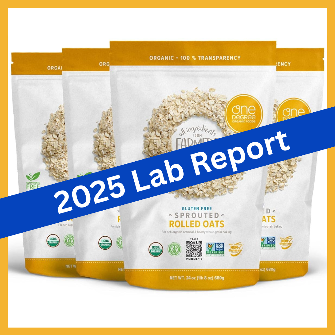 This lab report at the bottom of this article is for our 2025 retest of the One Degree Organic Sprouted Rolled Oats (in the yellow bag), test results that we have shared about previously (see comparative chart below). This 2025 follow up testing is the reason we removed this product from the Lab Tested Safer Choices List (scroll down to see the full updated Lab Tested Safer Choices List below). Only products that have tested “safe by all standards” are on our lab-tested safer choices list.