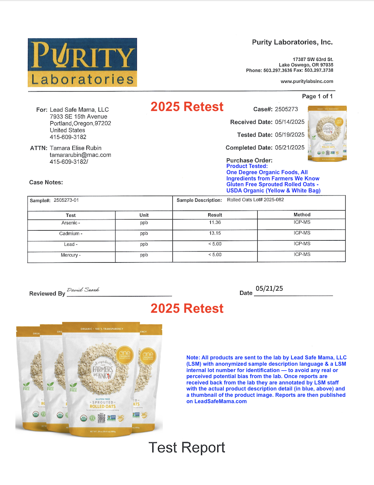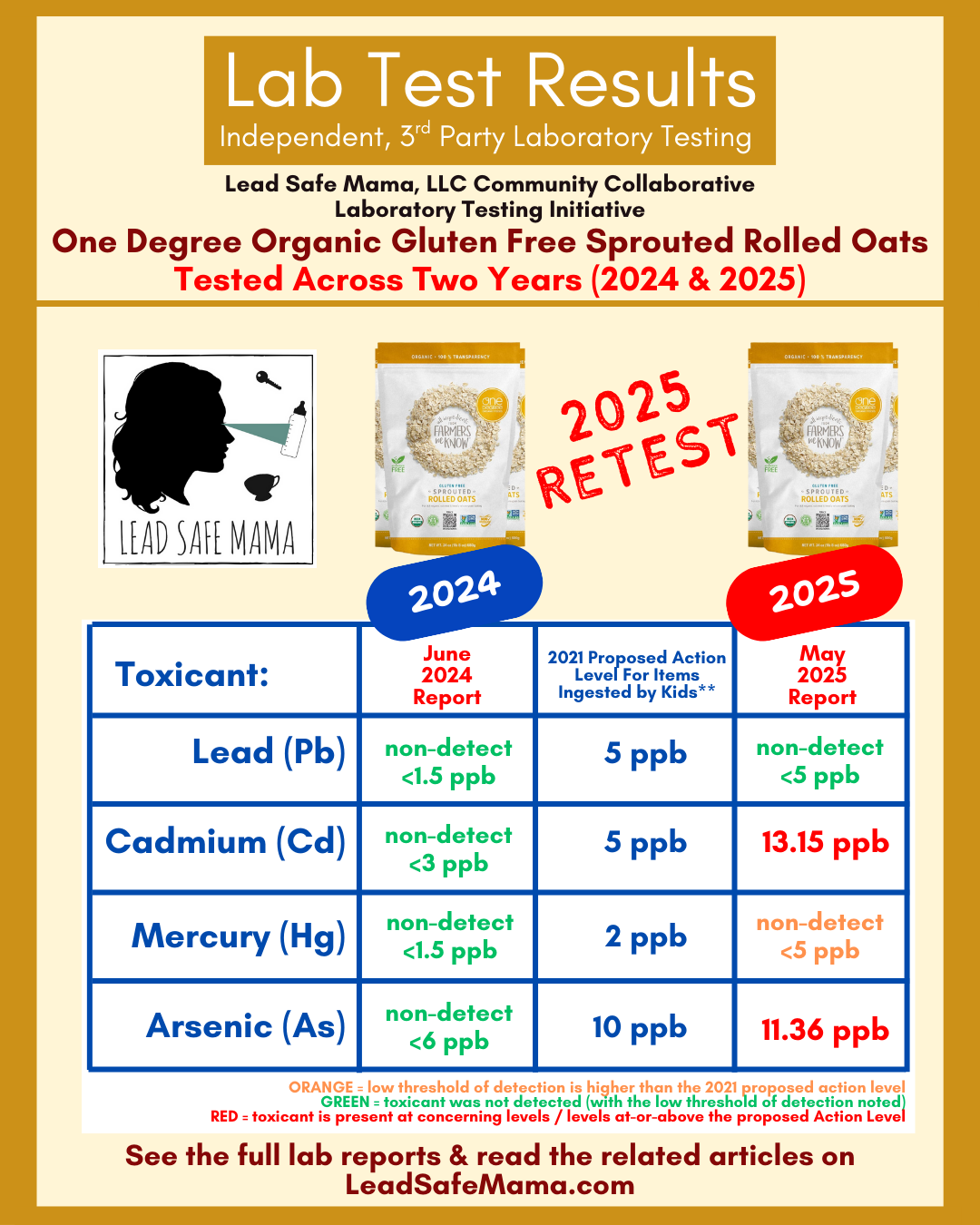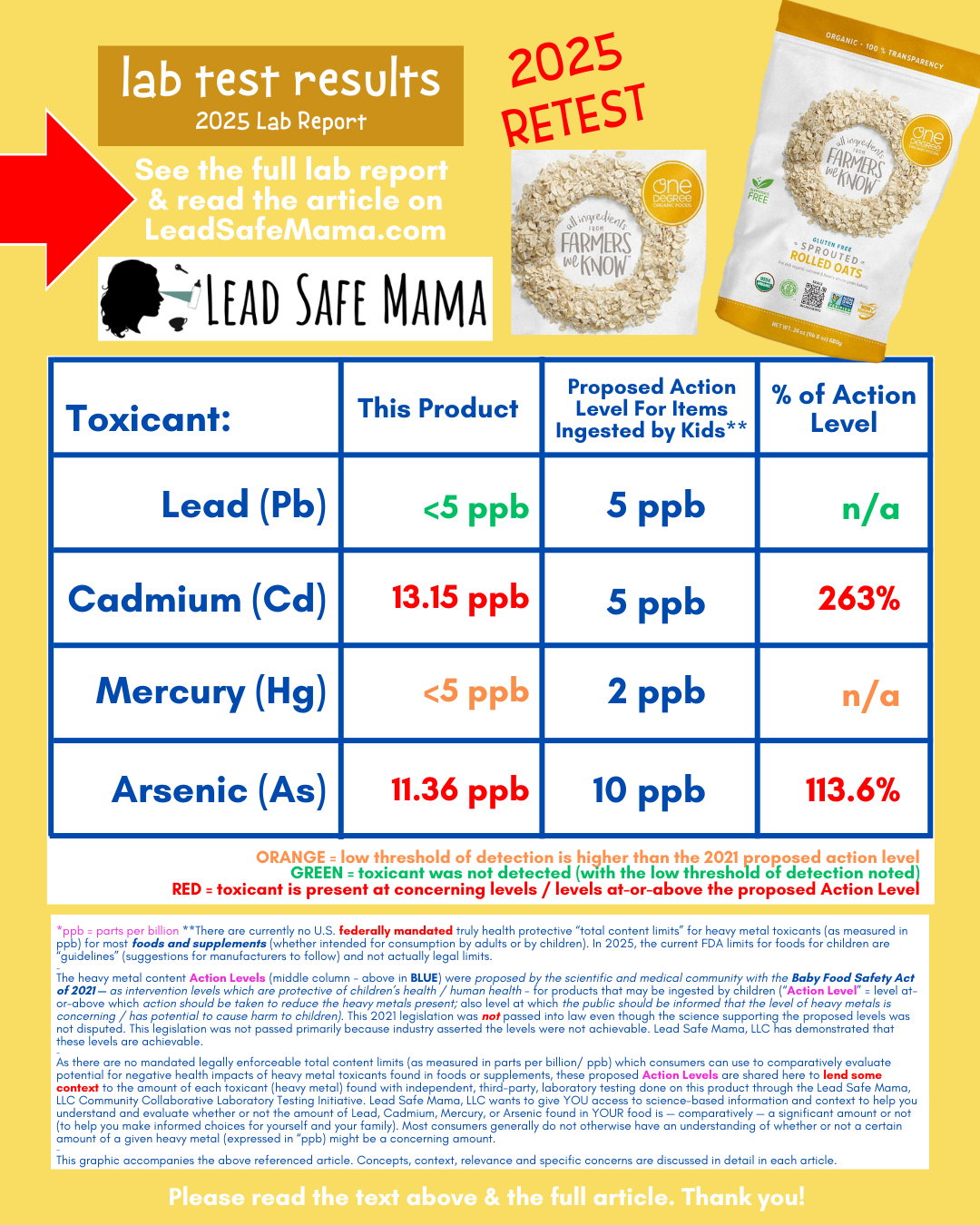 2025 Retest of One Degree Organic Gluten Free Sprouted Rolled Oats — Laboratory Testing for Lead, Cadmium, Mercury, & Arsenic.