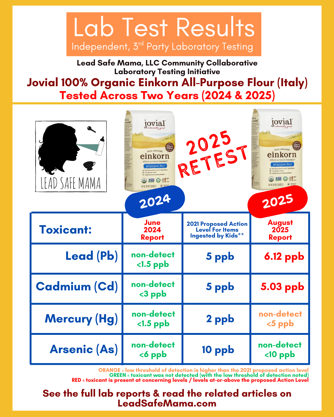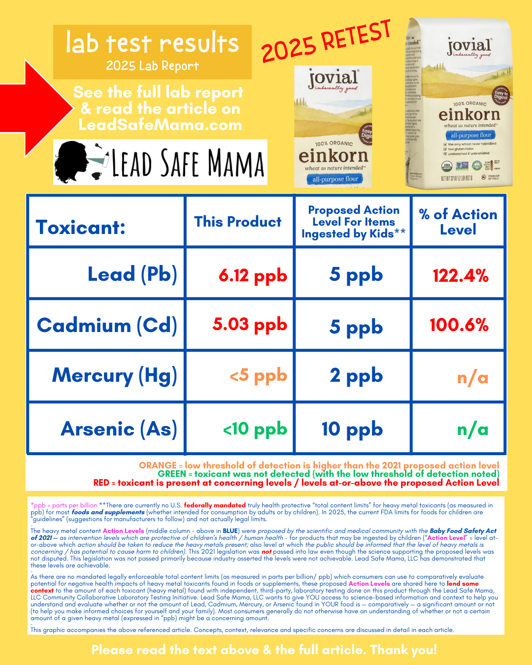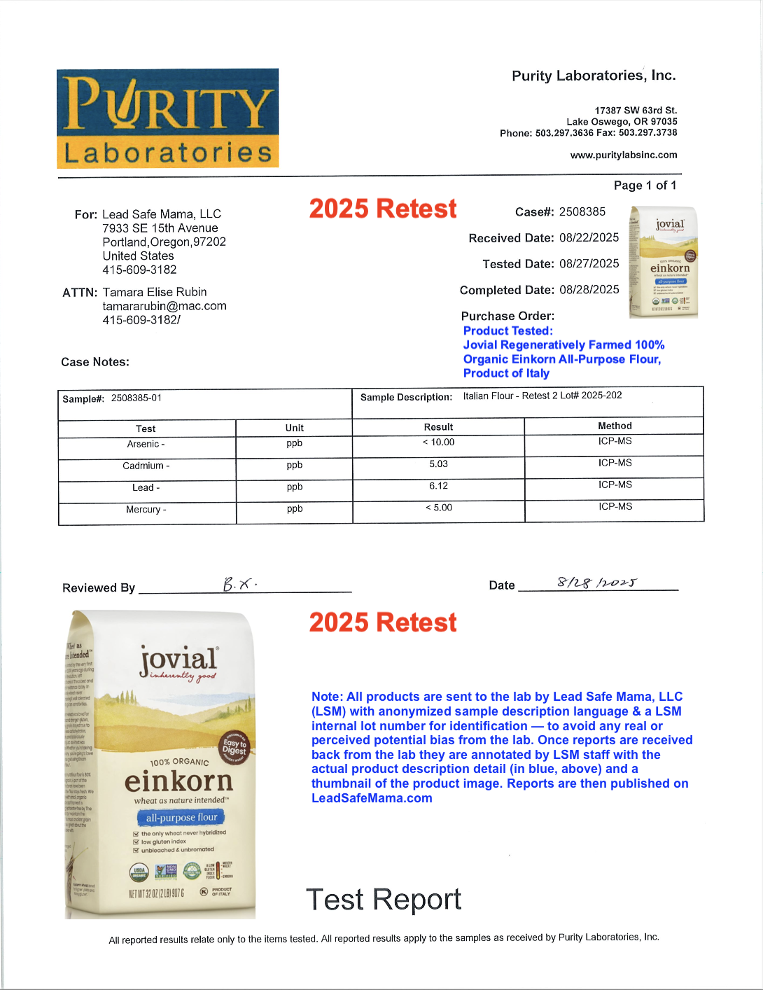 2025 Retest of Organic Jovial Einkorn All Purpose Flour (From Italy) — Laboratory Testing for Lead, Cadmium, Mercury, & Arsenic.