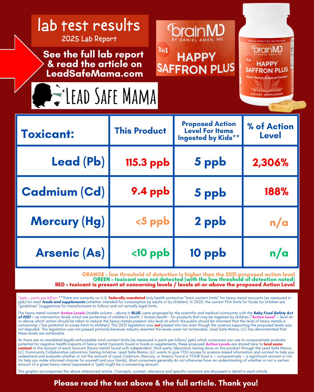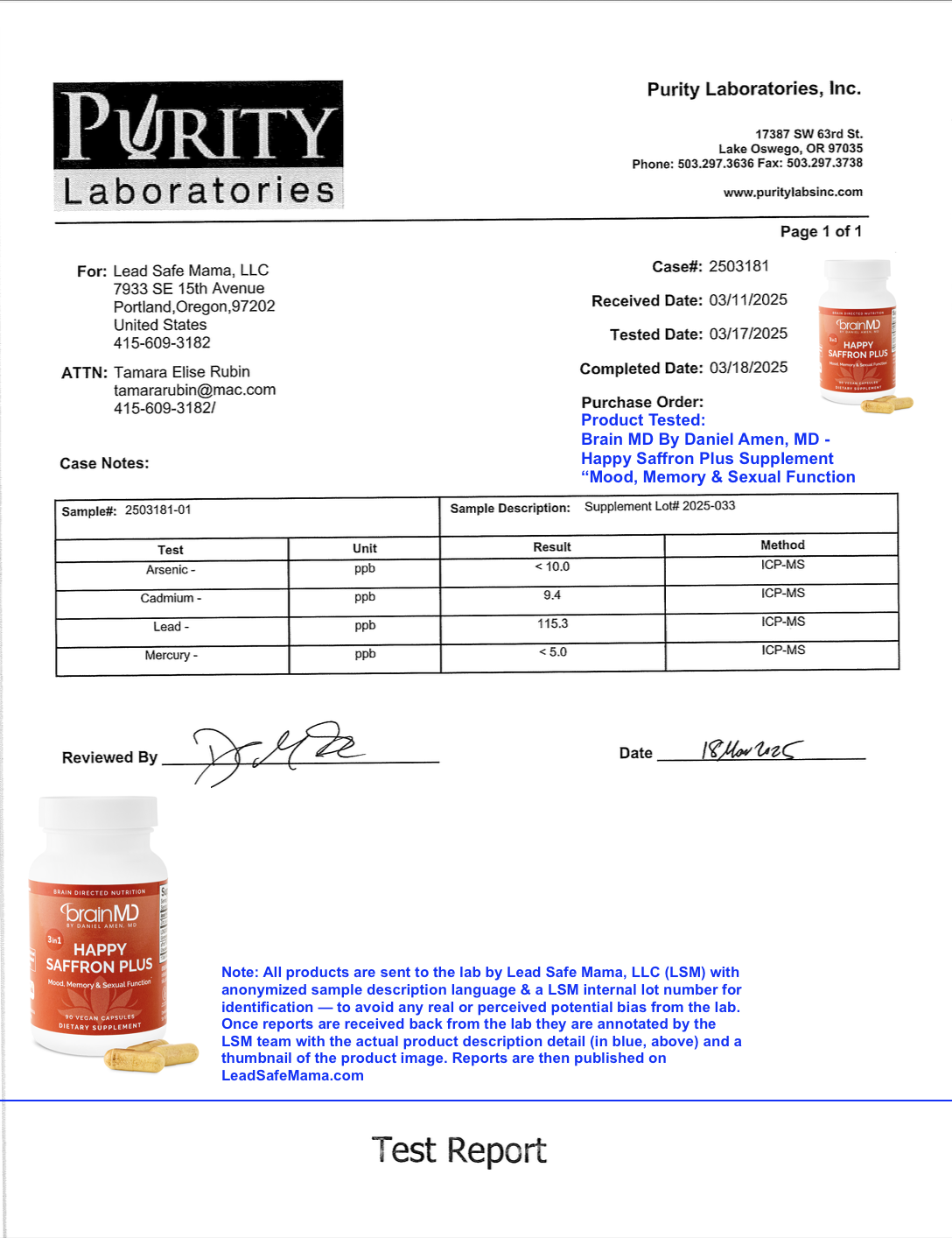 Independent, Third-Party Laboratory Testing of Brain MD by Daniel Amen, MD’s “Happy Saffron Plus” — Identifying Lead, Cadmium, Mercury, & Arsenic Contamination Levels.