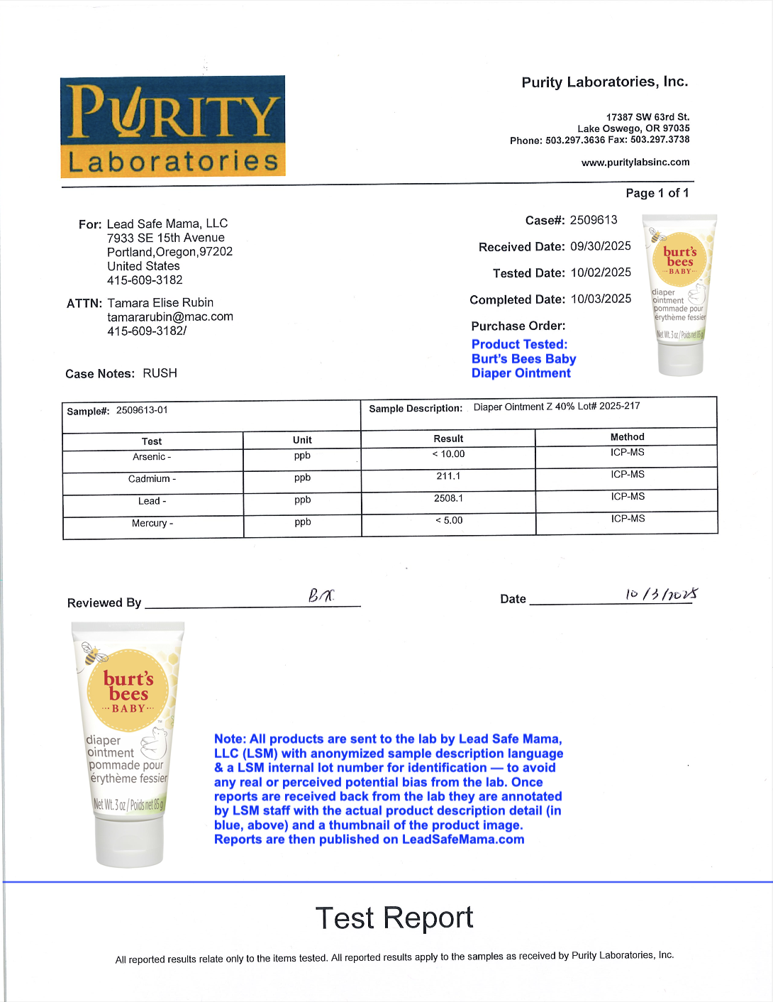 Independent, Third-Party Laboratory Testing of Burts Bees Baby Diaper Ointment for Lead, Cadmium, Mercury, & Arsenic.
