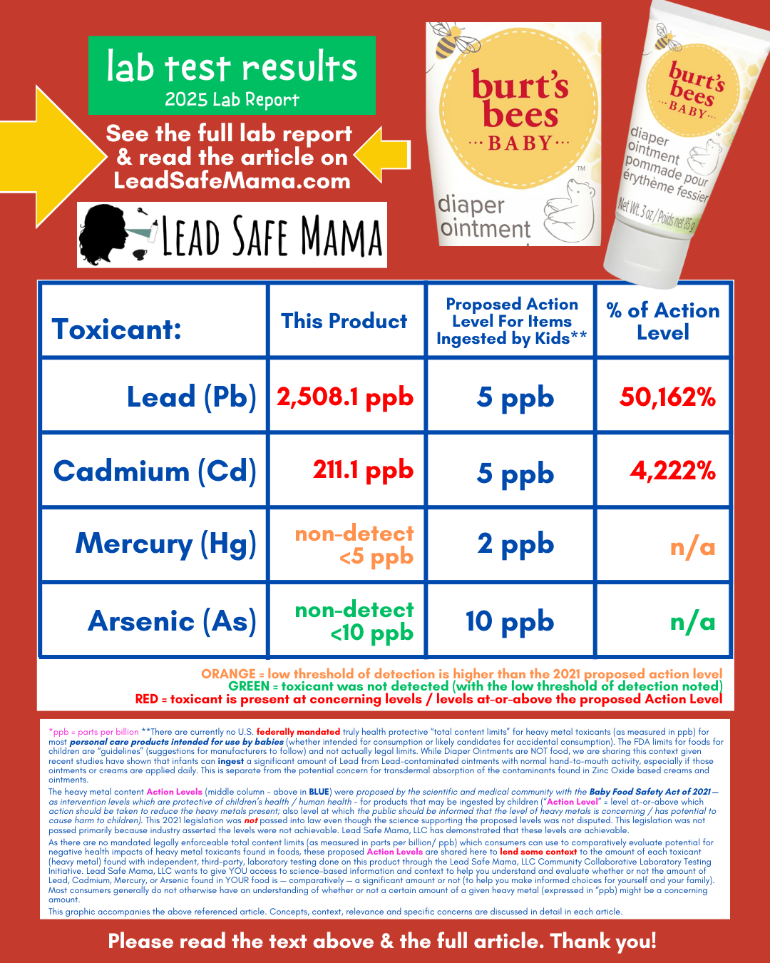 This product was listed in the article in which Consumer Reports originally stated that the diaper ointments included / listed in the article were free of heavy metals contamination (see image below, noting the products on their list are specifically free of Lead, Cadmium, and Mercury). As this is a Zinc-Oxide-based diaper ointment, any expert with knowledge of ingredients / heavy metals contamination could have told you that this would obviously not be the case. Zinc-Oxide is well known to consistently test positive for heavy metals, specifically including-but-not-limited-to Lead. Independent, third-party laboratory testing done through the Lead Safe Mama, LLC Community Collaborative Laboratory Testing Initiative confirmed this point of fact, each of the Zinc-Oxide-based ointments included in the Consumer Reports diaper ointment article did test positive for concerning levels of Lead.