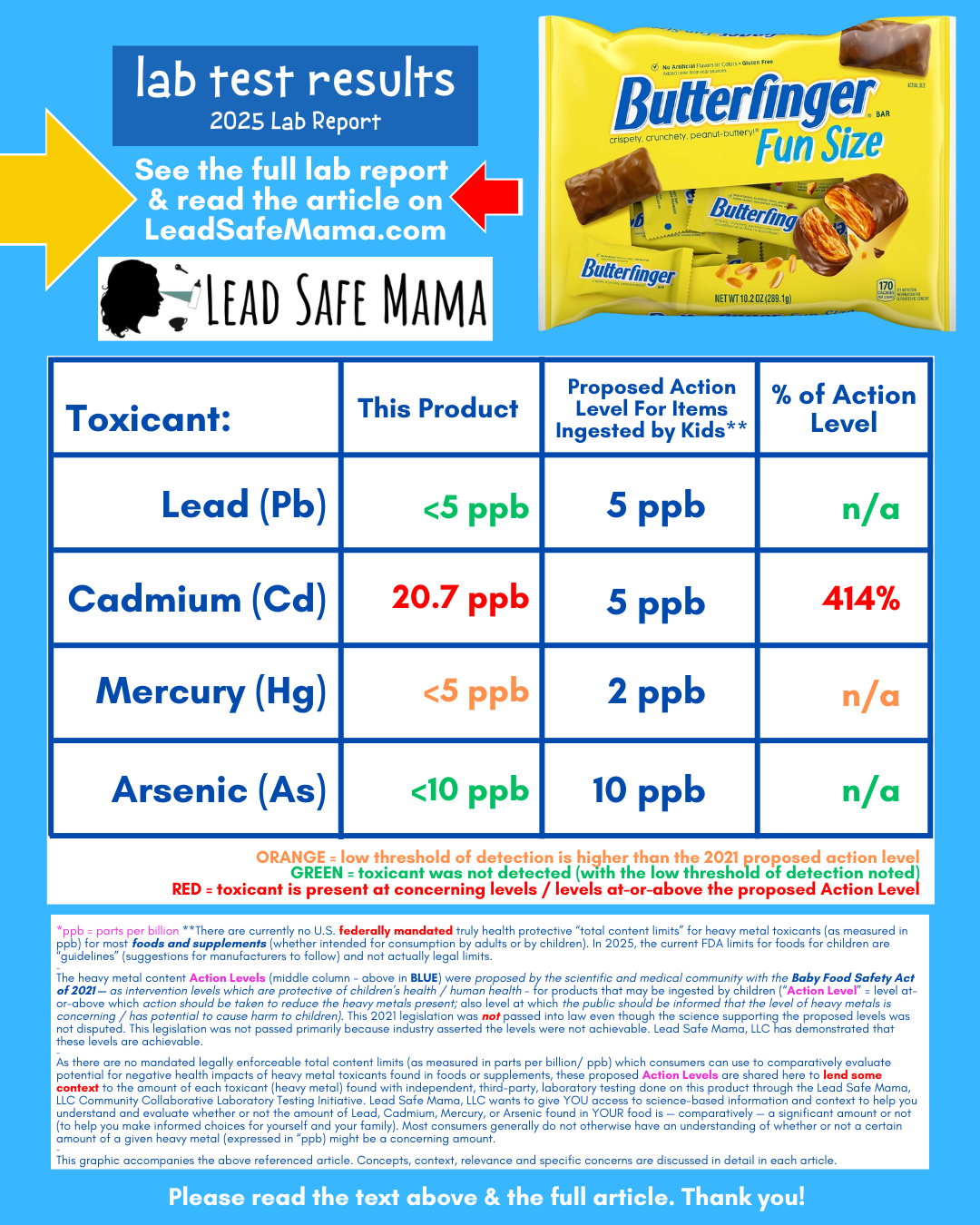 As this product is peanut butter flavored — and nearly every peanut butter flavored product that we have tested to date has tested positive for notable levels of Cadmium — we were not surprised to learn that these Fun Size Butterfinger candy bars also tested positive for Cadmium. Cadmium is a known carcinogen (it causes cancer), and it has been on the list of known carcinogens for more than 30 years (despite the common refrain from cocoa manufacturers that I have seen this year — that Cadmium is somehow “new” as a concern, and that somehow the risk are “not yet known”. If you see ANY cocoa manufacturer parroting this language, please know it is total hogwash (entirely false).