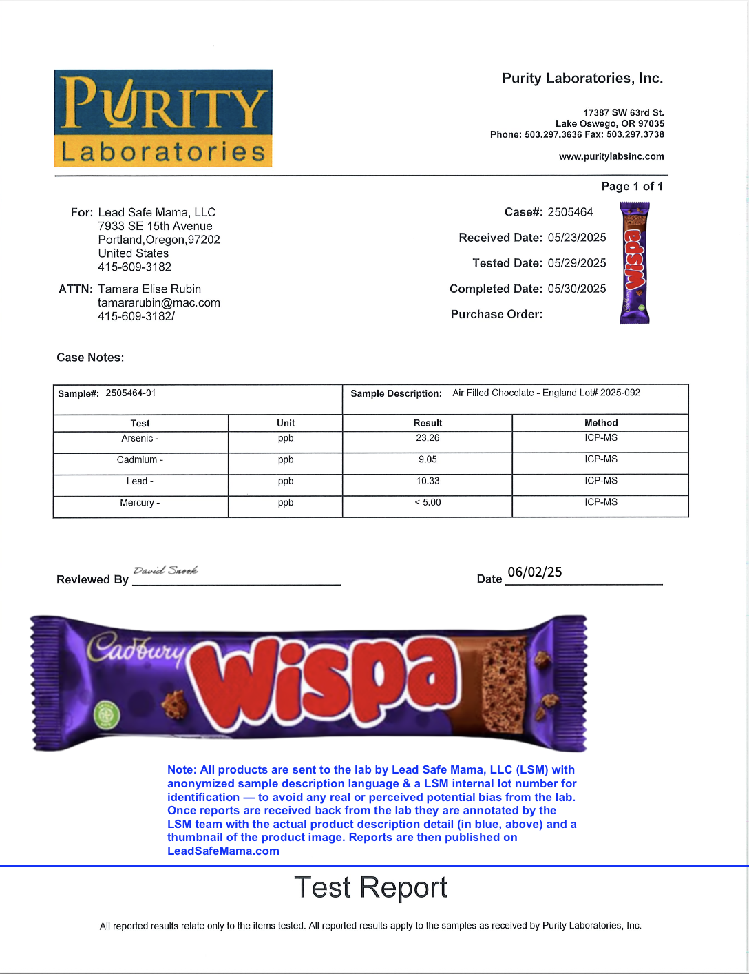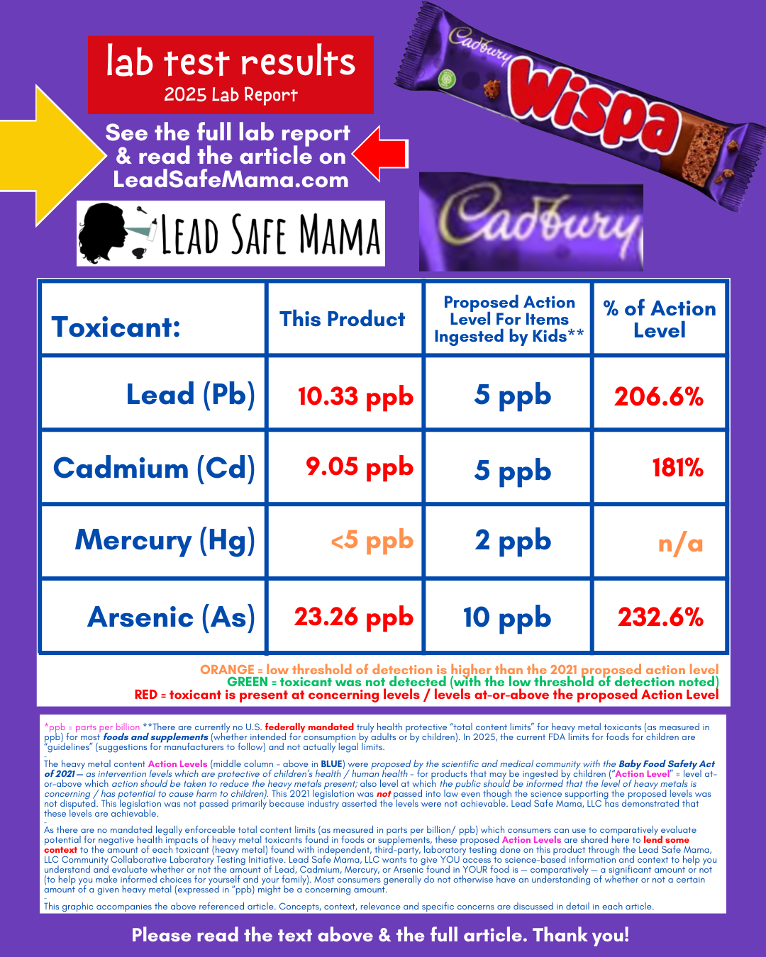 We tested the Wispa chocolate bar (by Cadbury, purchased in London, England in 2025 for testing) to help expand our data set for products purchased in England that we have tested through the Lead Safe Mama, LLC Community Collaborative Laboratory Testing Initiative. Why?