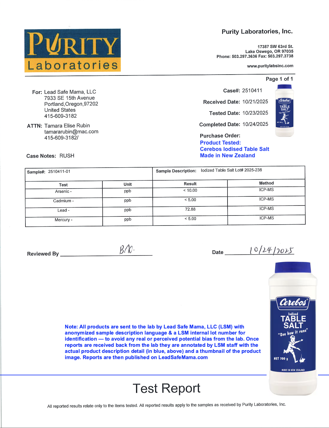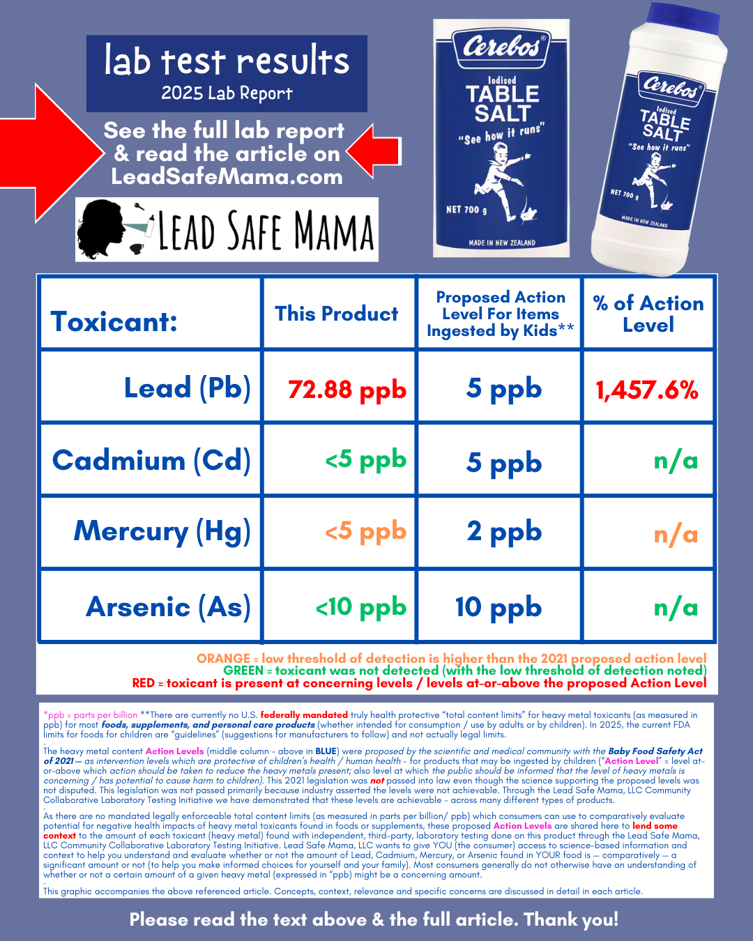 New Zealand Product: Independent, Third-Party Laboratory Testing of Cerebos Iodised Table Salt — Identifying Lead, Cadmium, Mercury, & Arsenic Contamination Levels.