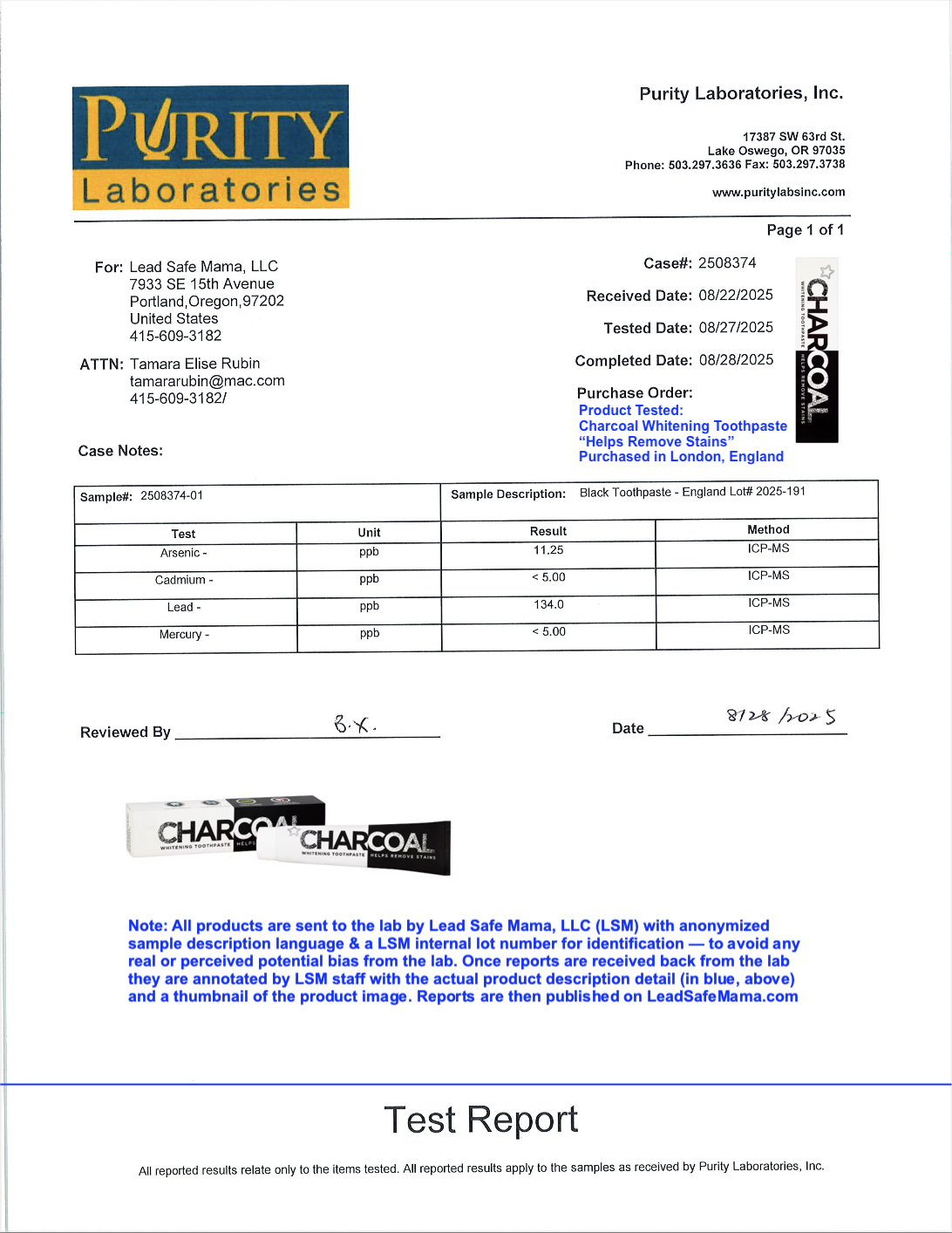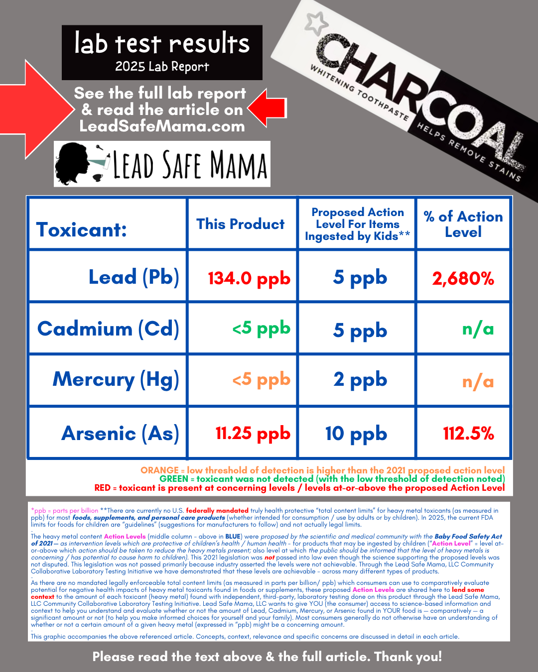 English Product: Independent, Third-Party Laboratory Testing of Charcoal Whitening Toothpaste — Identifying Lead, Cadmium, Mercury, & Arsenic Contamination Levels.