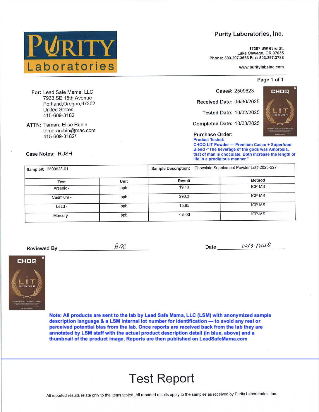 Independent, Third-Party Laboratory Testing of CHOQ LIT Powder — Quantifying Lead, Cadmium, Mercury, & Arsenic Contamination Levels.