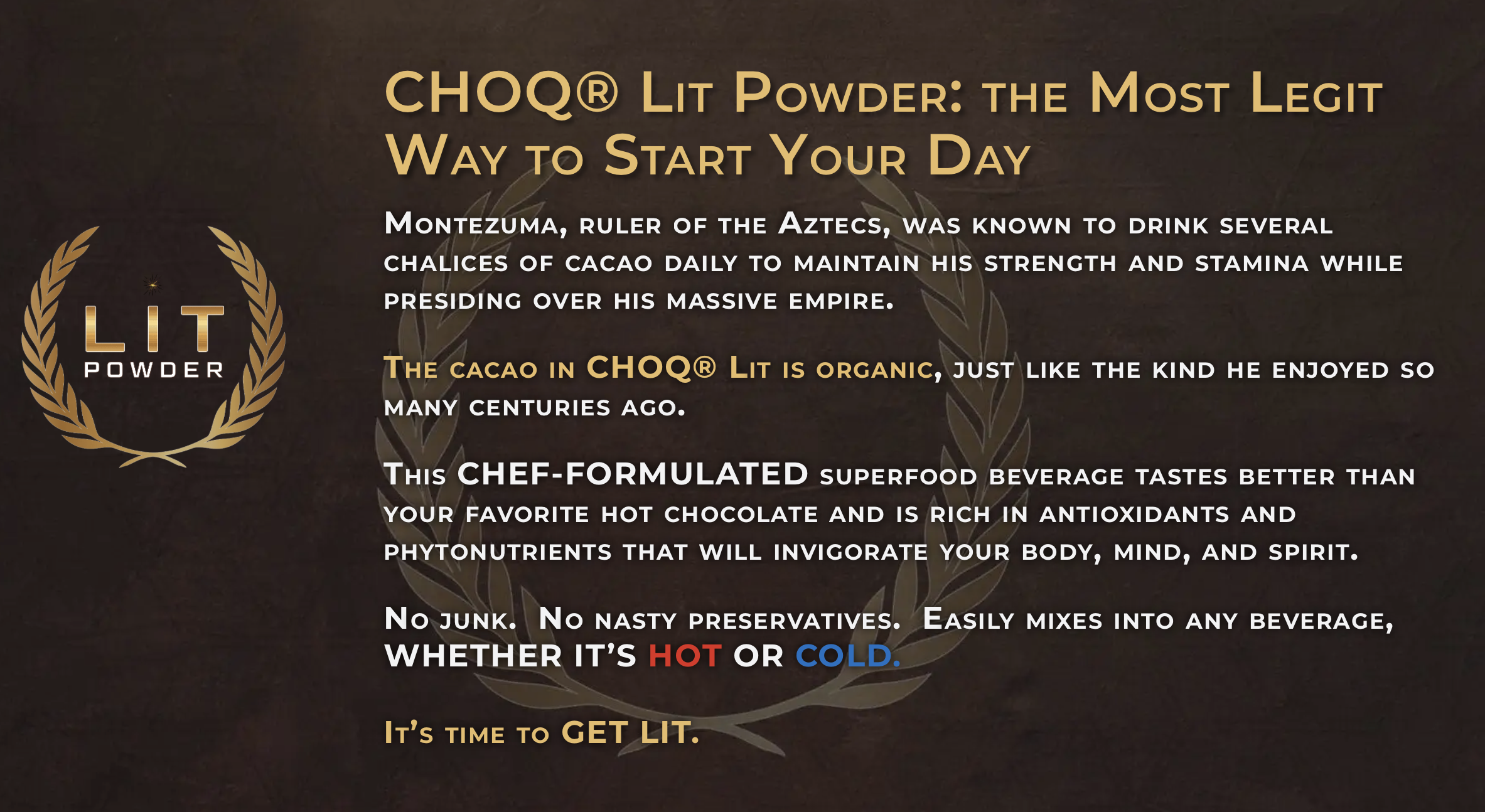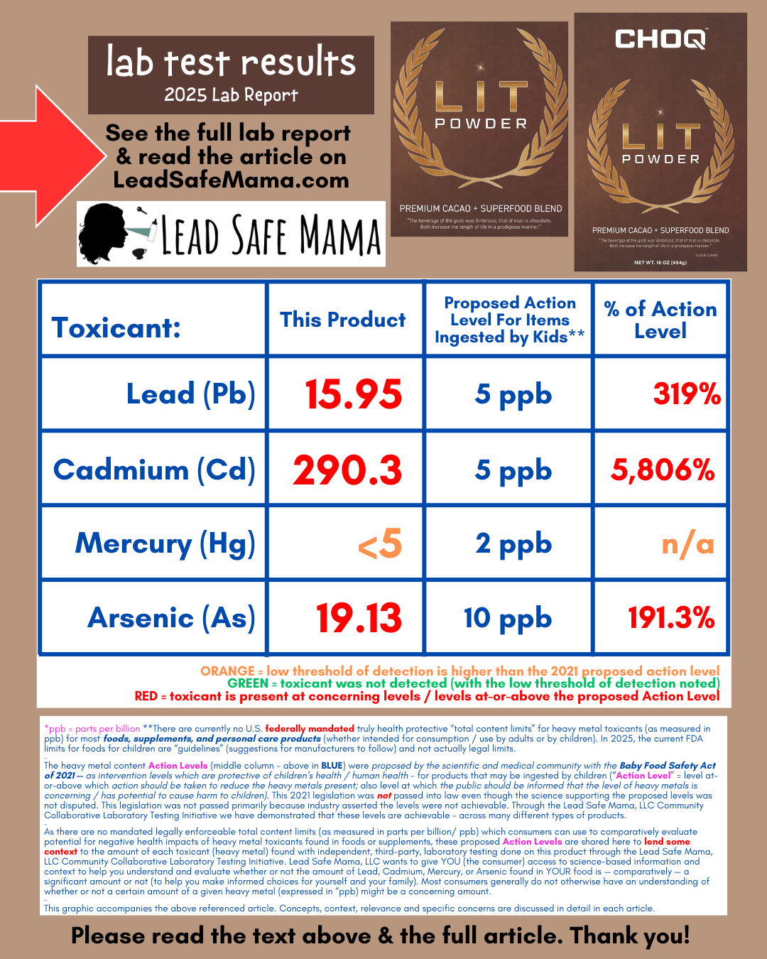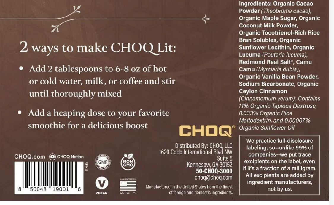 This CHOQ LIT Powder (“Premium Cacao + Superfood Blend) is somehow sold as a “supplement” but — if you examine the ingredient profile (first image below) — it is clear that this product is simply a heavy-metals-contaminated chocolate milk drink mix marketed to / targeted at a male audience. Ironically (or coincidentally?) one of the ingredients is Redmond Real Salt — a salt which is also, independently, a heavily Lead-contaminated product (lab report here). Continue reading below the image with the ingredients. [This should truly be classified as a hot chocolate drink mix, and not a supplement!]