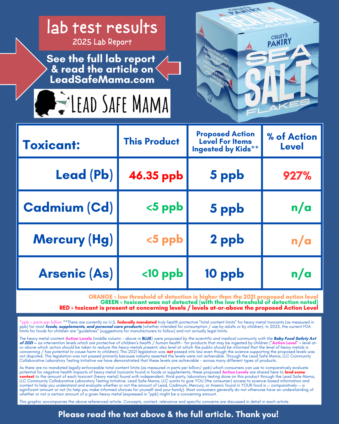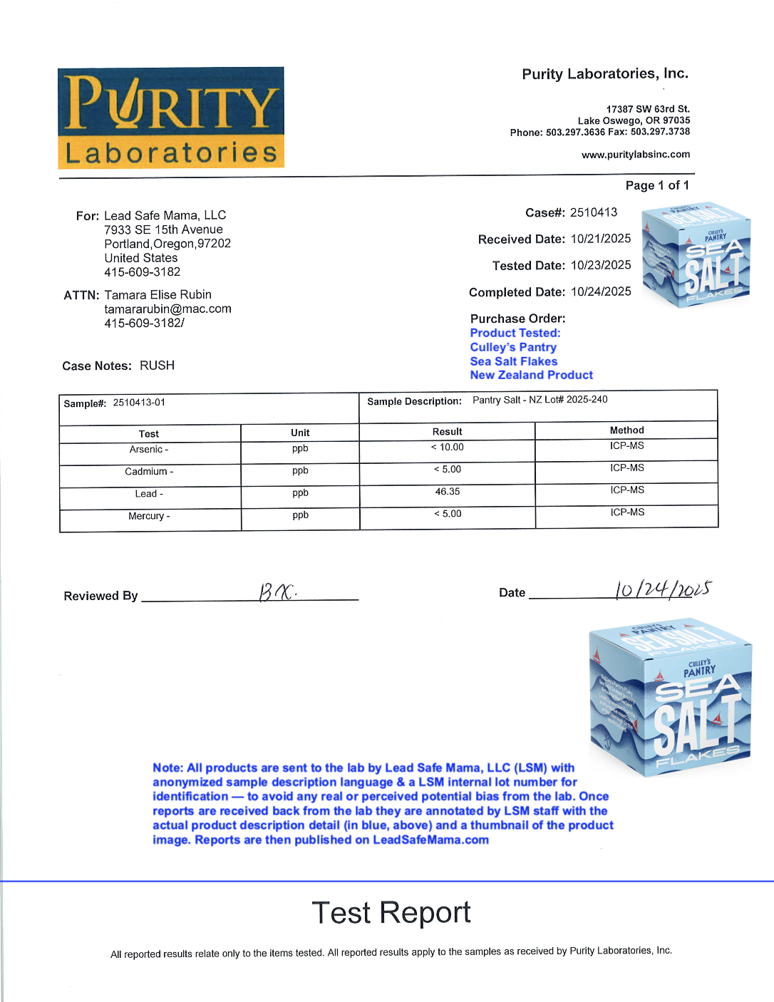 New Zealand Product: Independent, Third-Party Laboratory Testing of Culley’s Pantry Sea Salt Flakes — Identifying Lead, Cadmium, Mercury, & Arsenic Contamination Levels.