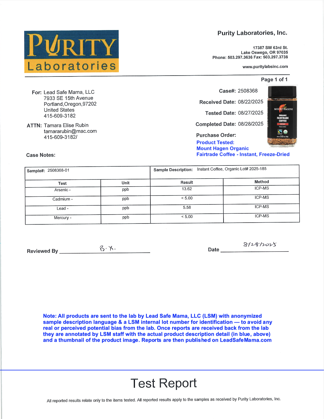 Testing Mount Hagen Organic Fair Trade Instant Coffee for Lead, Cadmium, Mercury, & Arsenic with Independent, Third-Party Laboratory Testing