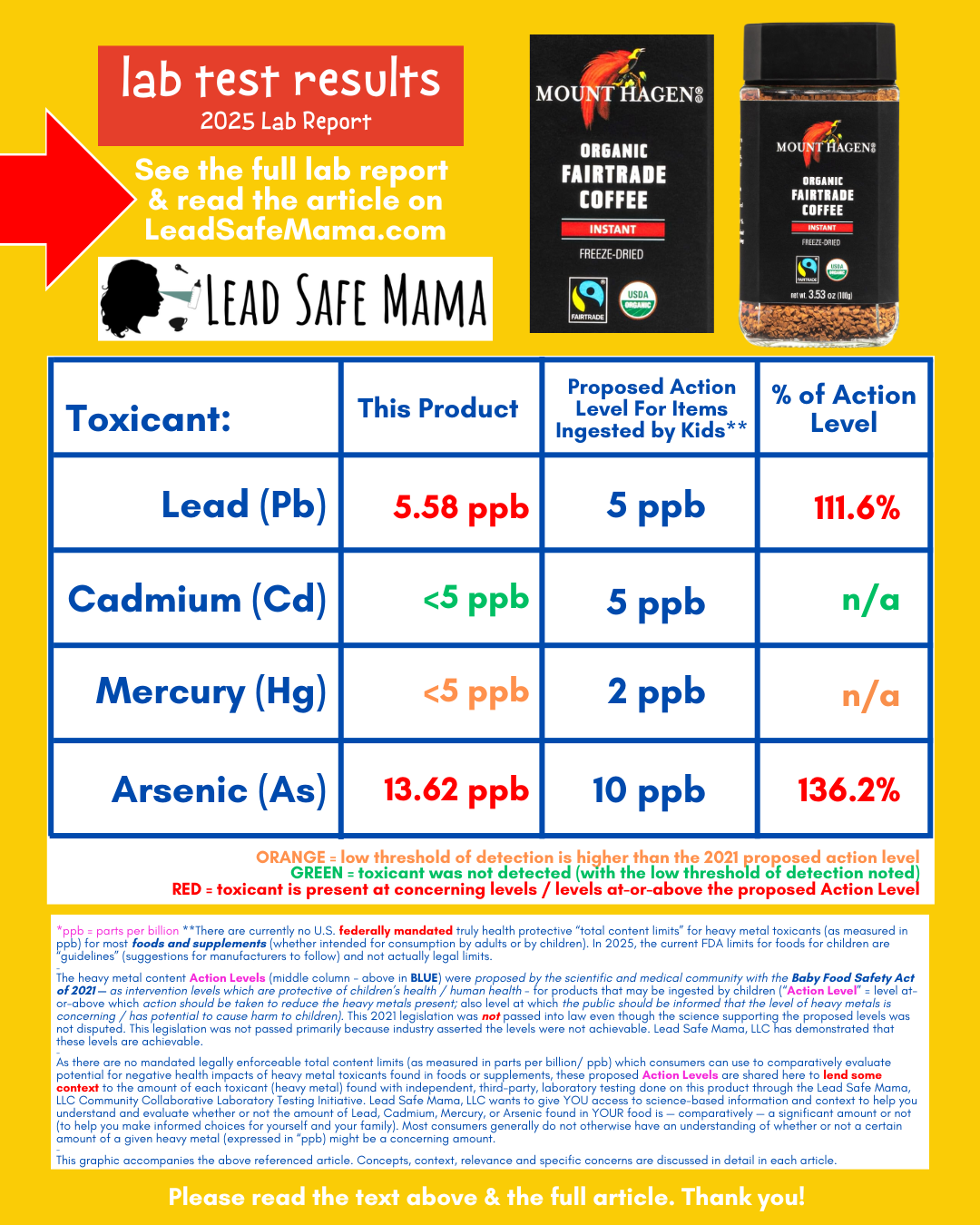 We tested one other organic instant coffee product earlier this year, so — while I was disappointed that this product tested positive, as I have used it extensively in the past, long-before we started doing laboratory testing of foods and other consumable products — I was not surprised to learn that the Mount Hagan Organic Instant Coffee tested positive for both Lead and Arsenic. Of note: the toxicant levels found in this Organic Mount. Hagen Instant Coffee product are considerably lower than what we found in the Anthony’s Organic Instant Coffee. Here’s the link to the other article with the lab report for the Anthony’s product.