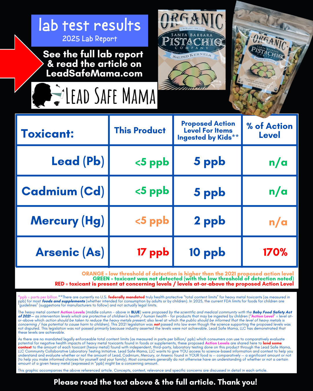 These organic salted whole kernel pistachios from Santa Barbara Pistachio Company are the cleanest pistachios that we have tested so far (non-detect for Lead), and while this product does not make our “Lab Tested Safer Choices List” (because it did test positive for Arsenic), these pistachios may be a good choice for families looking for a pistachio product and wanting to avoid Lead-contaminated foods.