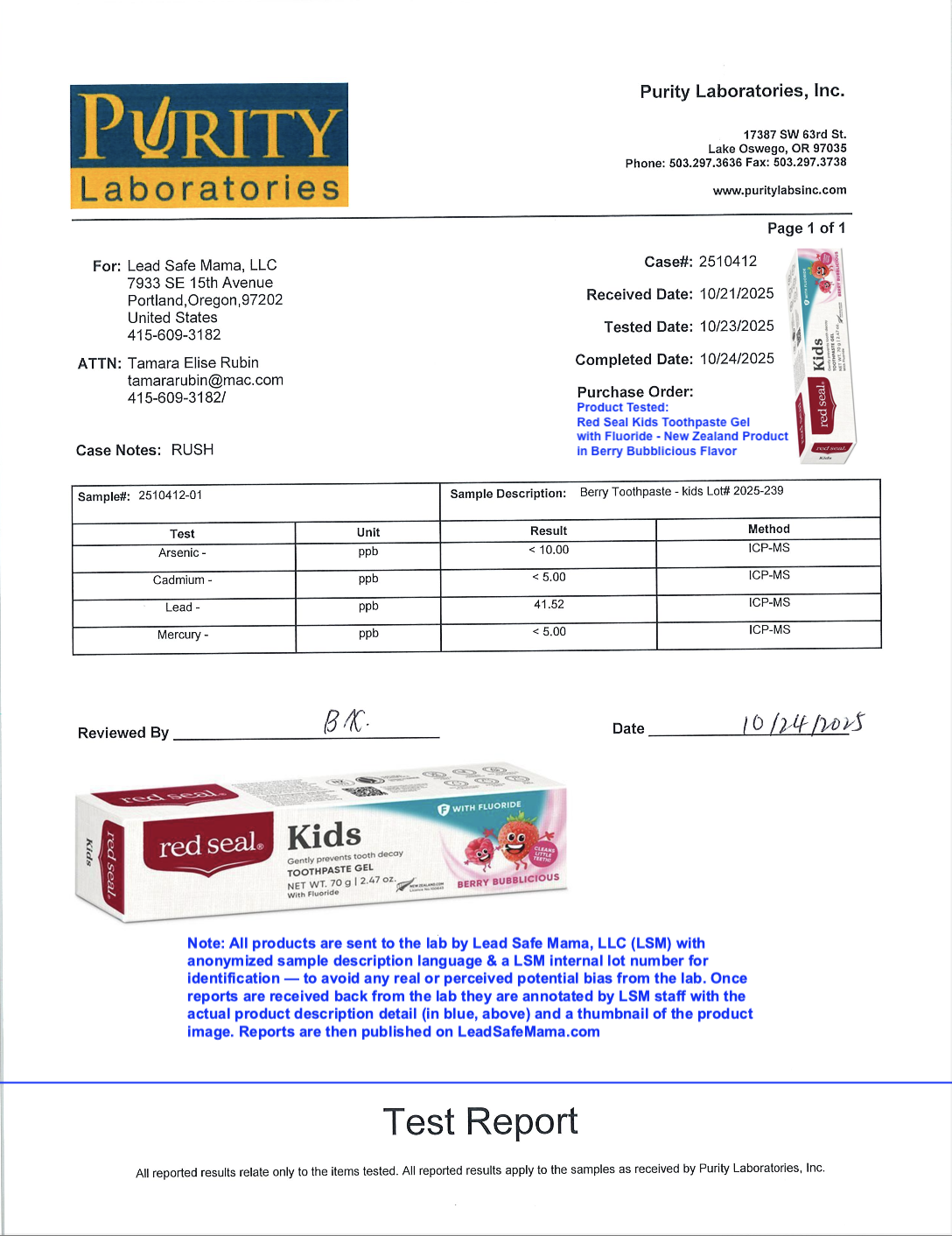 New Zealand Product: Independent, Third-Party Laboratory Testing of Red Seal Kids Toothpaste Gel with Fluoride in Berry Bubblicious Flavor — Identifying Lead, Cadmium, Mercury, & Arsenic Contamination Levels.