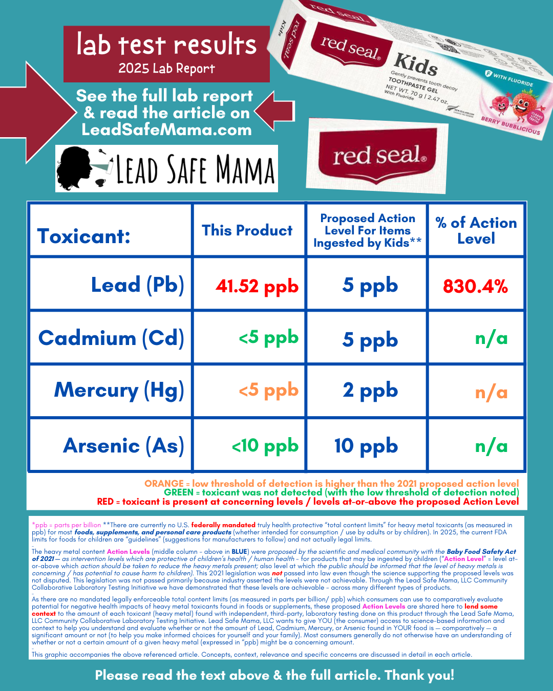 Below is an expanding list of products (foods, supplements, cosmetics, and personal care items, including sunscreens and toothpaste) for which the lab reports showed “non-detect” for Lead, Mercury, Cadmium, and Arsenic with independent, third-party, community-funded laboratory testing coordinated by Lead Safe Mama, LLC (an Oregon-based small business with a unique community-collaborative business model and a focus on consumer goods safety and childhood Lead poisoning prevention).