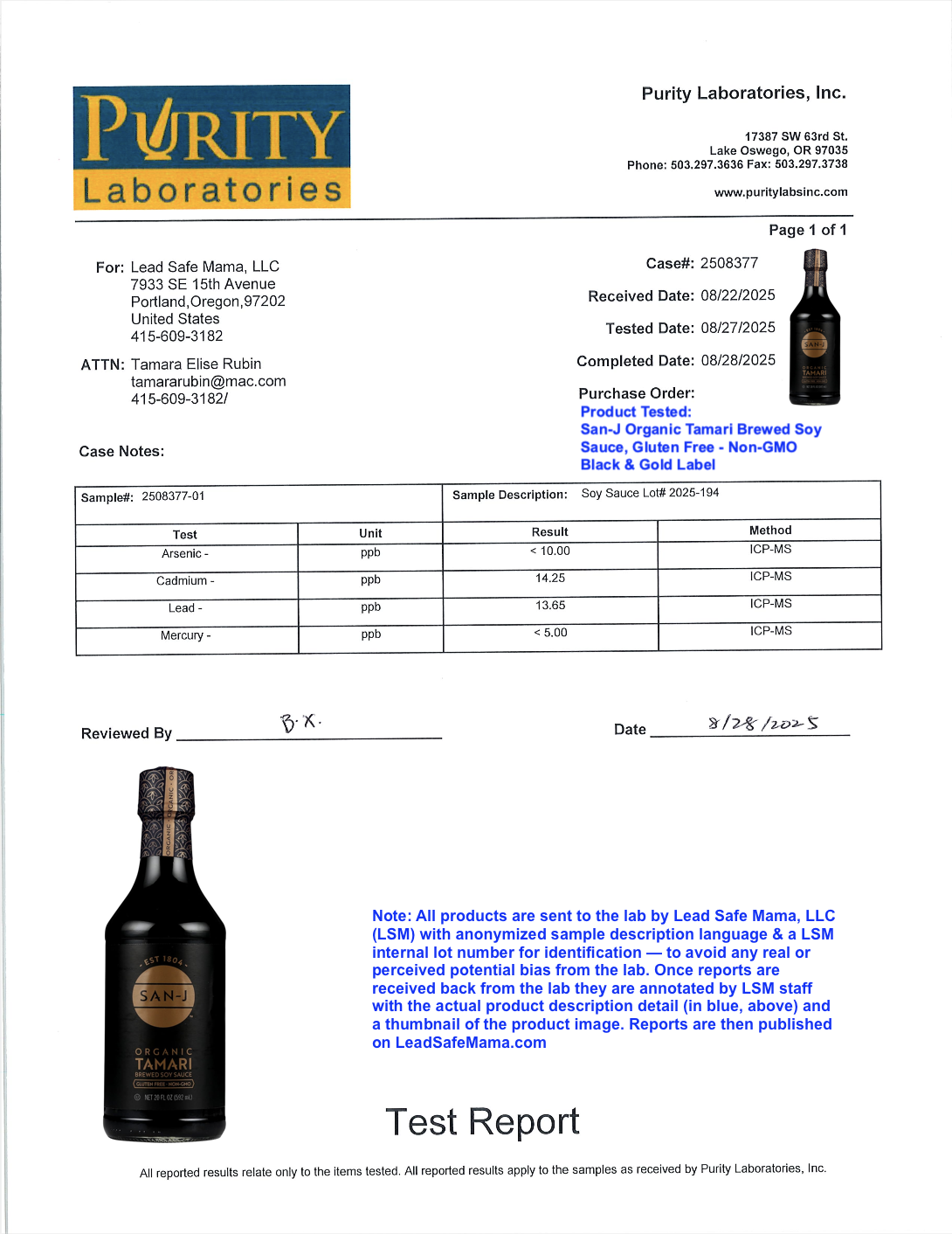 Testing San-J Organic Tamari Brewed Soy Sauce for Lead, Cadmium, Mercury, & Arsenic with Independent, Third-Party Laboratory Testing