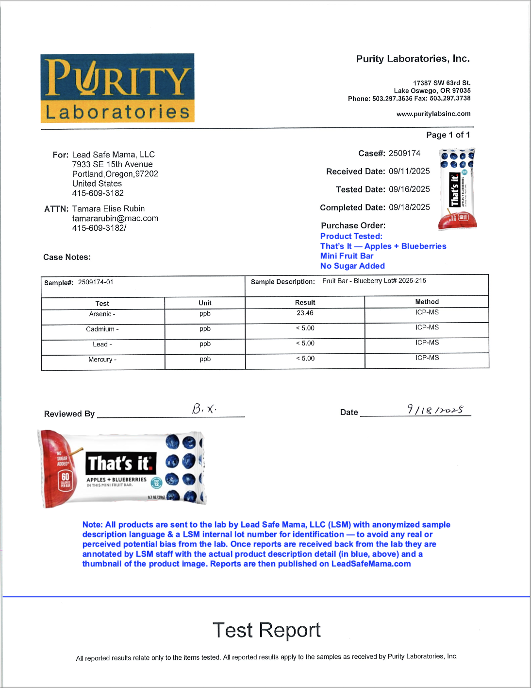 Testing That’s It Apples + Blueberries Mini Fruit Bars for Lead, Cadmium, Mercury, & Arsenic with Independent, Third-Party Laboratory Testing