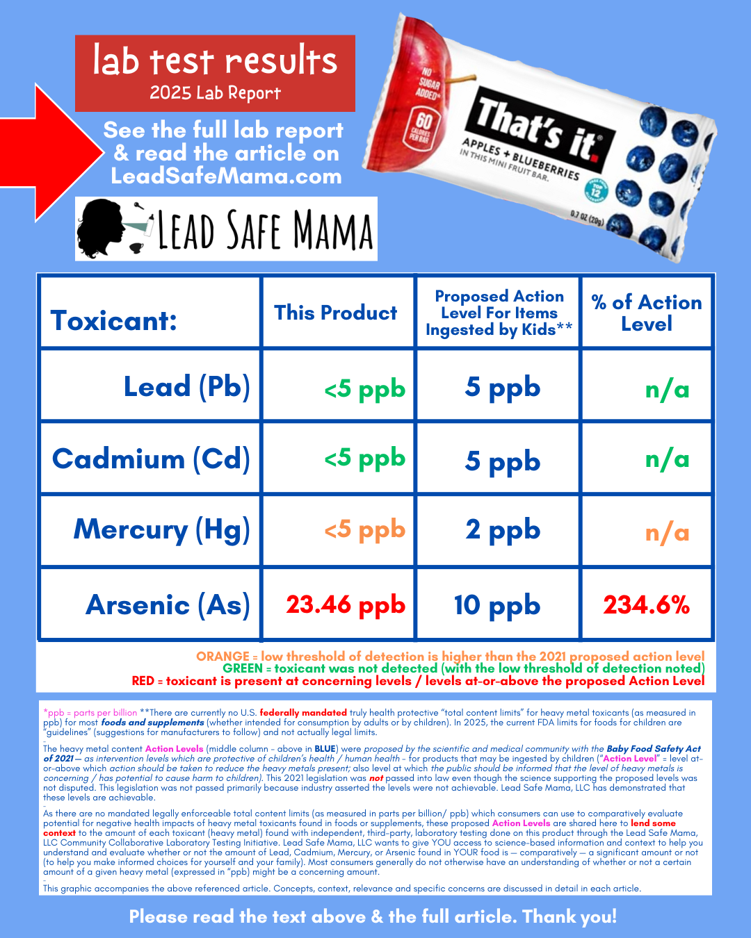 The product pictured above – the That’s It Apples + Blueberries Mini Fruit Bar (the type one purchases in a bag of mixed flavors at Costco, as lunch snacks for children) tested positive for concerning level of Arsenic. The level of Arsenic found in this product is specifically and expressly considered concerning by the medical and scientific communities if a product is considered to be intended for consumption by young children — which this product clearly is (based both on the marketing accompanying this product and the product size which is intended to be included in a child’s lunch as a lunch-box snack).