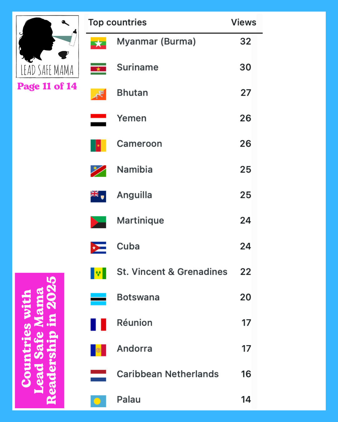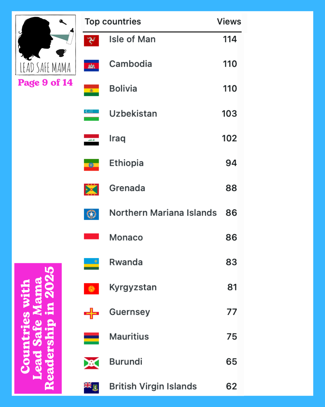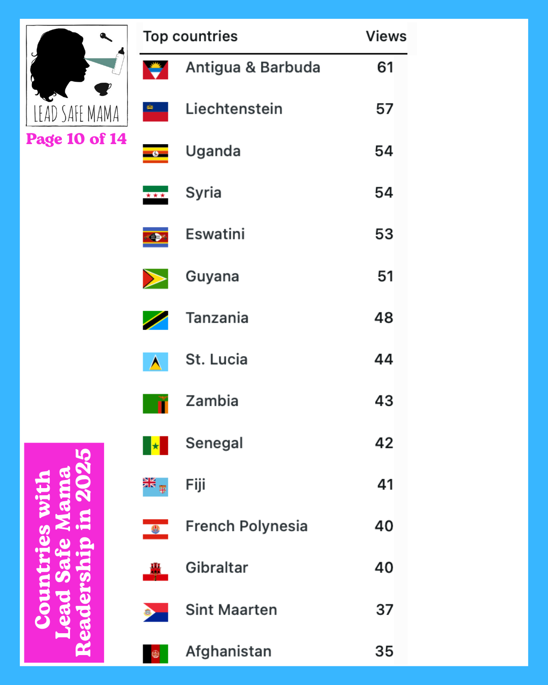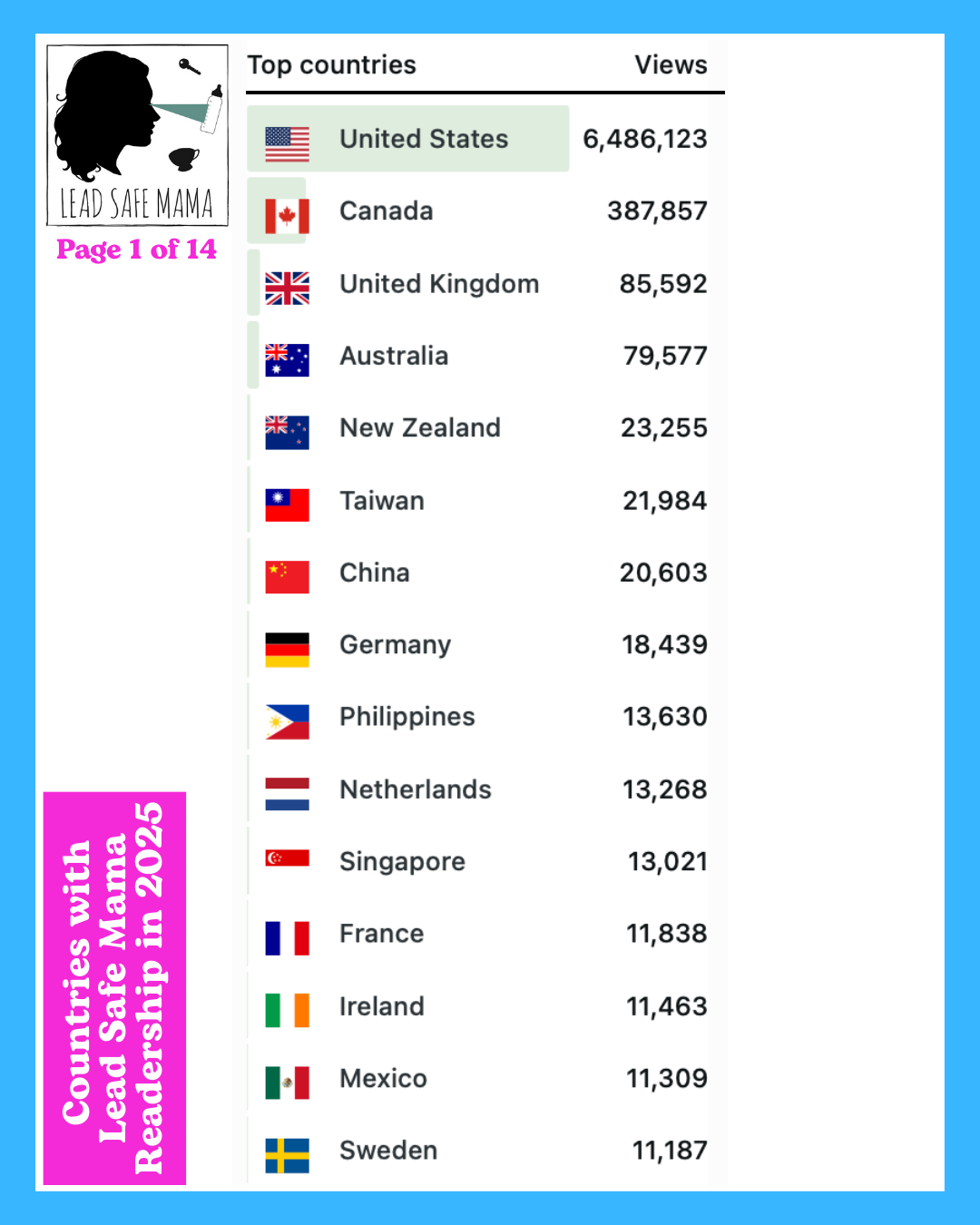 There are 14 images below — these images list all of the countries with Lead Safe Mama readership in 2025 (in order of readership as measured by unique page views) – check them out!