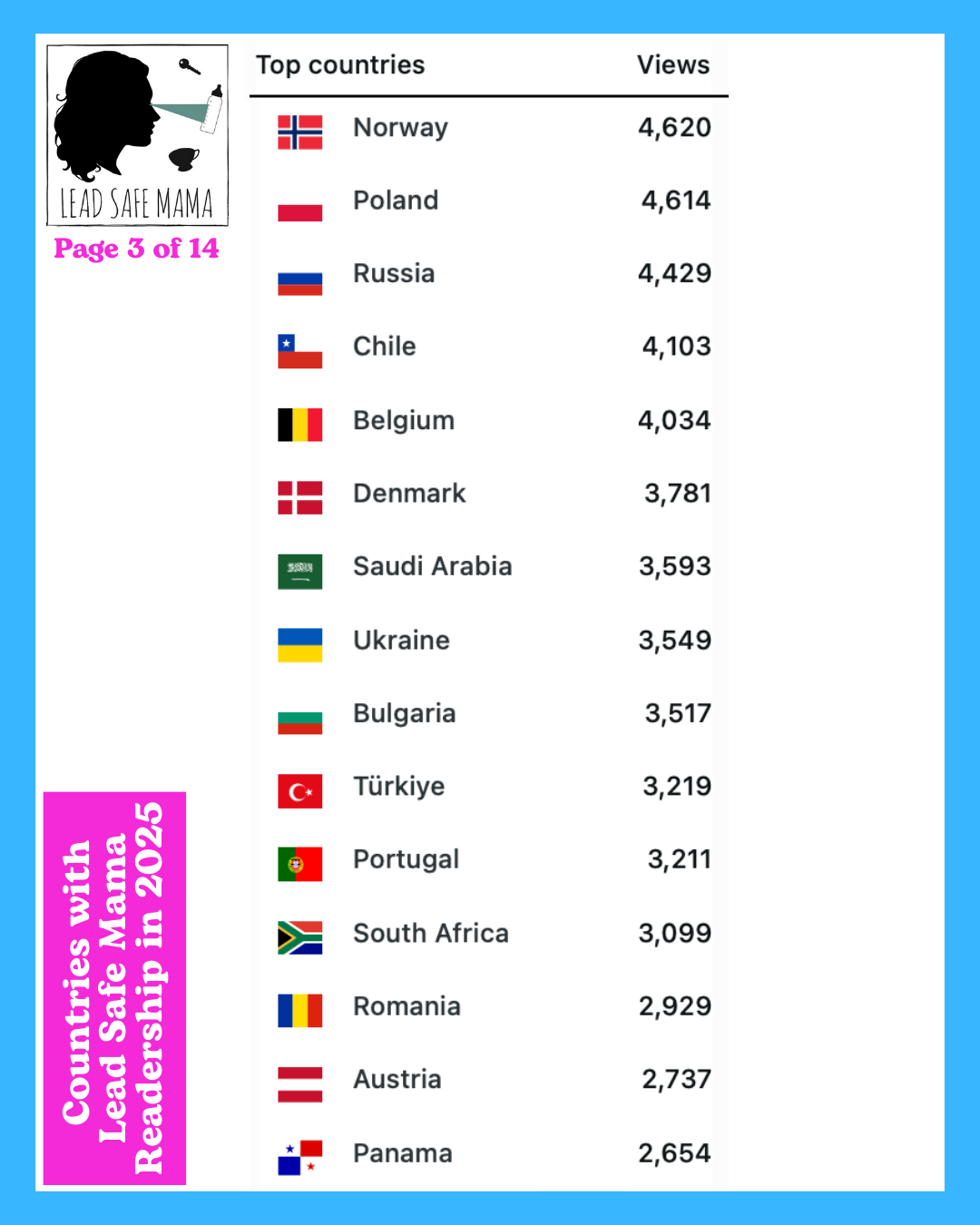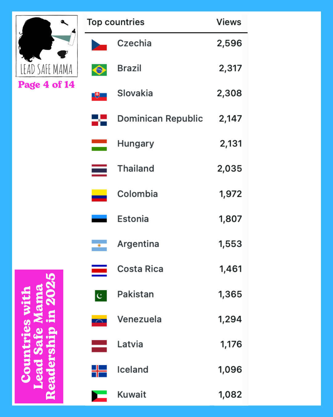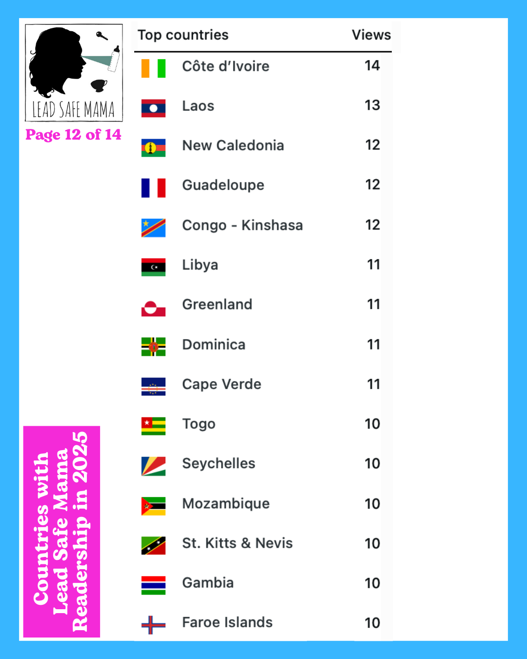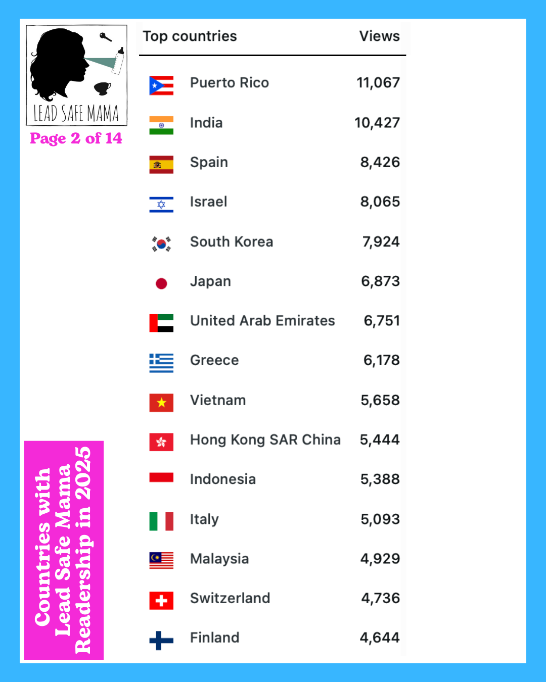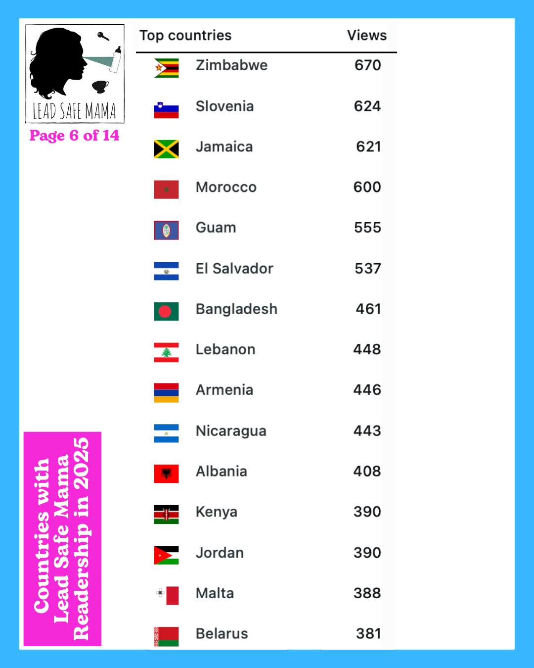 There are 14 images below — these images list all of the countries with Lead Safe Mama readership in 2025 (in order of readership as measured by unique page views) – check them out!