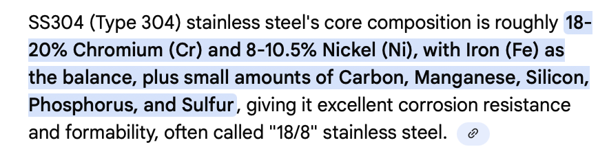 Nickel, Chromium, Molybdenum, and Iron levels are bolded and distinguished in green font below, as those elements are the primary components of Stainless Steel. It is the variances in proportions of these metals that typically determine the grade and type (and related uses) of the Stainless Steel quality. In this case, the quality used for this product is considered “304 Stainless Steel.” Here’s a short online description of it: