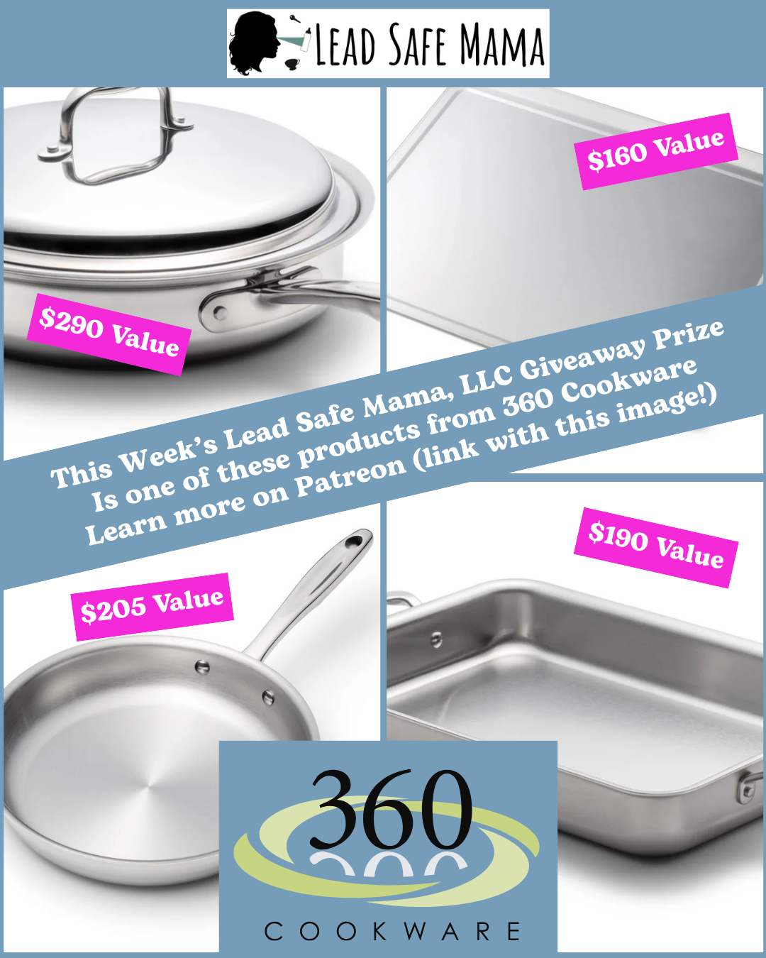 This month, we are hosting a total of THREE 360 Cookware Product Giveaways! You can also find each of these products on sale right now with a 20% off discount for Lead Safe Mama community members using the code “LeadSafeMama” on 360 Cookware’s site! This may be a great option if you have some Christmas cash but haven’t decided what to get yet! If I didn’t already have two, I would probably personally splurge on one of their heirloom-quality Stainless Steel cookie sheets!