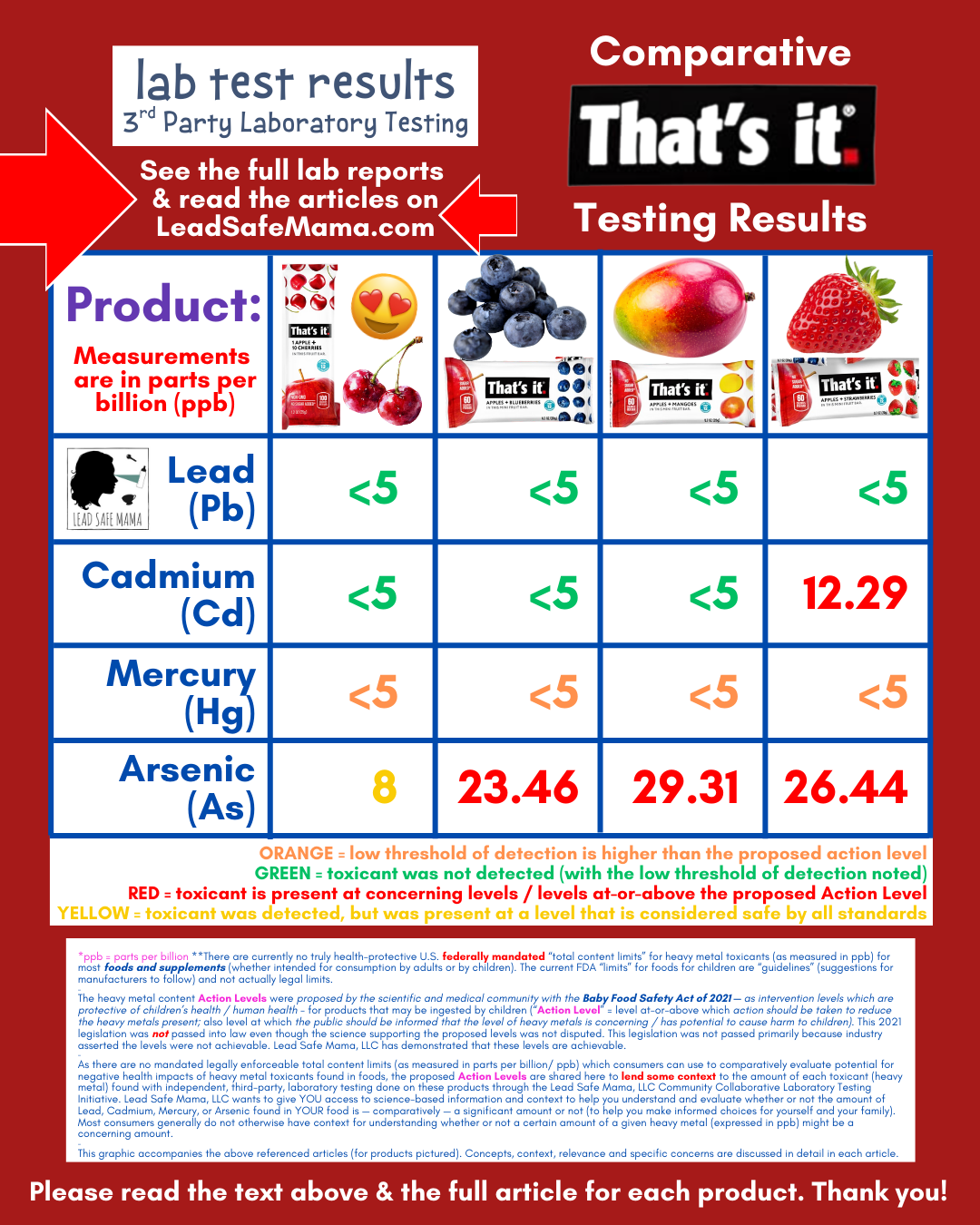 The chart above compares the independent, third-party laboratory test results of the four different That’s It brand fruit snack bar products that we have tested to date for heavy metals (with testing done via independent, third party laboratories).