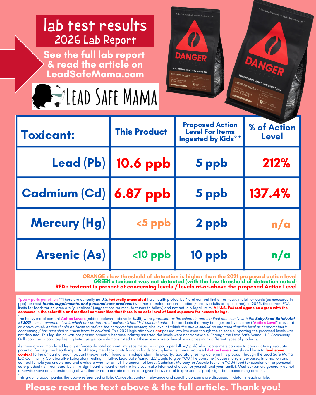 Please scroll down to see both the sharable social media graphic and the full original report with independent, third-party lab tests results for this product. As all federal agencies agree with the consensus in the scientific and medical communities that there is no safe level of Lead exposure – and as coffee is a product that one typically consumes AT LEAST once a day, and usually every day of the week (and as people often stick with the same brand and flavor of coffee for months or even years) — we are going to highly recommend AGAINST using this product. We have found quite a few coffee products that have tested with “non-detect” results for Lead (and for other heavy metals as well), and we’d like to encourage you to check out those options as alternatives.